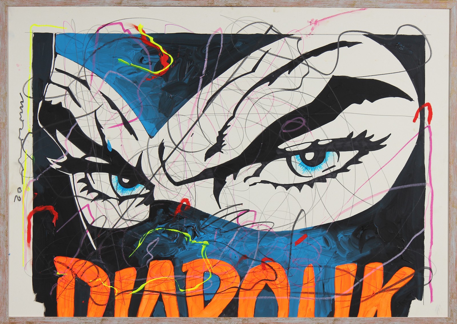 MANERA ENRICO (n. 1947) Diabolik. 2002. Tecnica mista su tela. Cm 70,00 x 100,00. Firma e anno sul lato a sinistra. Autentica dell' artista su fotografia. Cornice presente