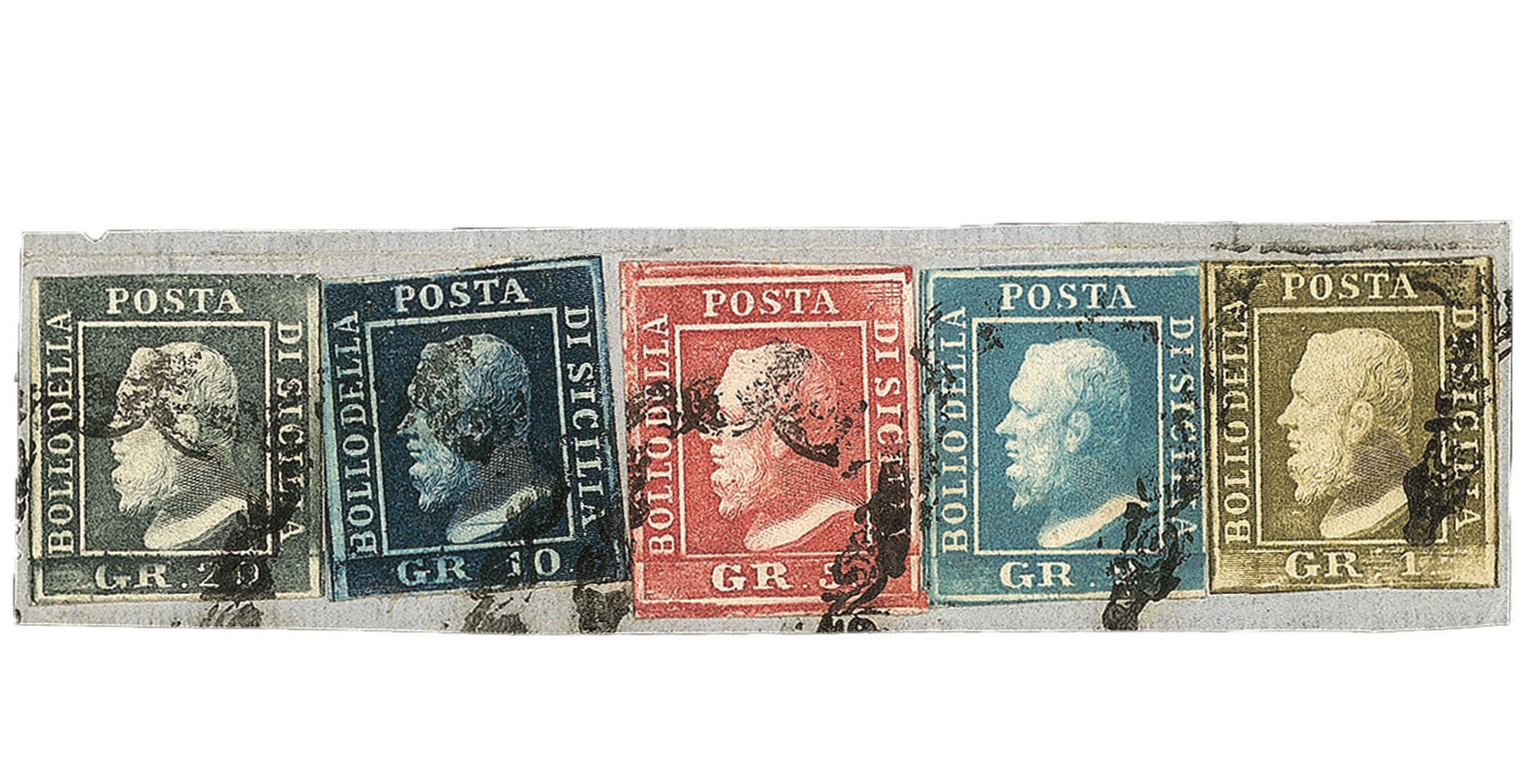 Antichi Stati Italiani - Sicilia - Frammento con affrancatura pentacolore (13 + 12b + 9 rit.46 + 8b + 4)Frammento con affrancatura pentacolore composta da 20 grana grigio ardesia + 10 grana indaco + 5 grana rosa carminio I tavola ritocco 46 + 2 grana azzurro verdastro III tavola + 1 grano oliva chiaro II tavola (13 + 12b + 9 rit.46 + 8b + 4) con margini da buoni a ottimi - cert. Alberto Diena