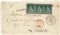 Pistoia (p.ti 11) ripetuto tre volte su striscia orizzontale di tre del 4 crazie verde azzurro su azzurro (6a) con ottimi margini in ogni lato (riparata orizzontalmente in alto) - bustina per Londra via Levanto 21 APR.58 e Genova 23 APR 58 - da esaminare - cert. Sorani