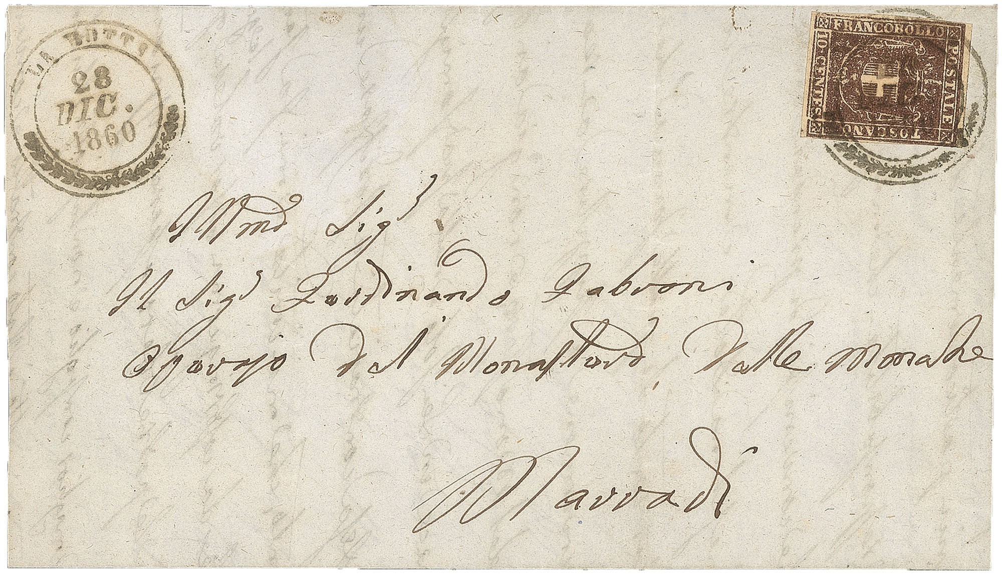 Antichi Stati Italiani - Toscana - Lettera (19)Lettera affrancata con 10 cent bruno (19) con annullo La Rotta 28 DIC.1860 (p.ti 12) per Marradi