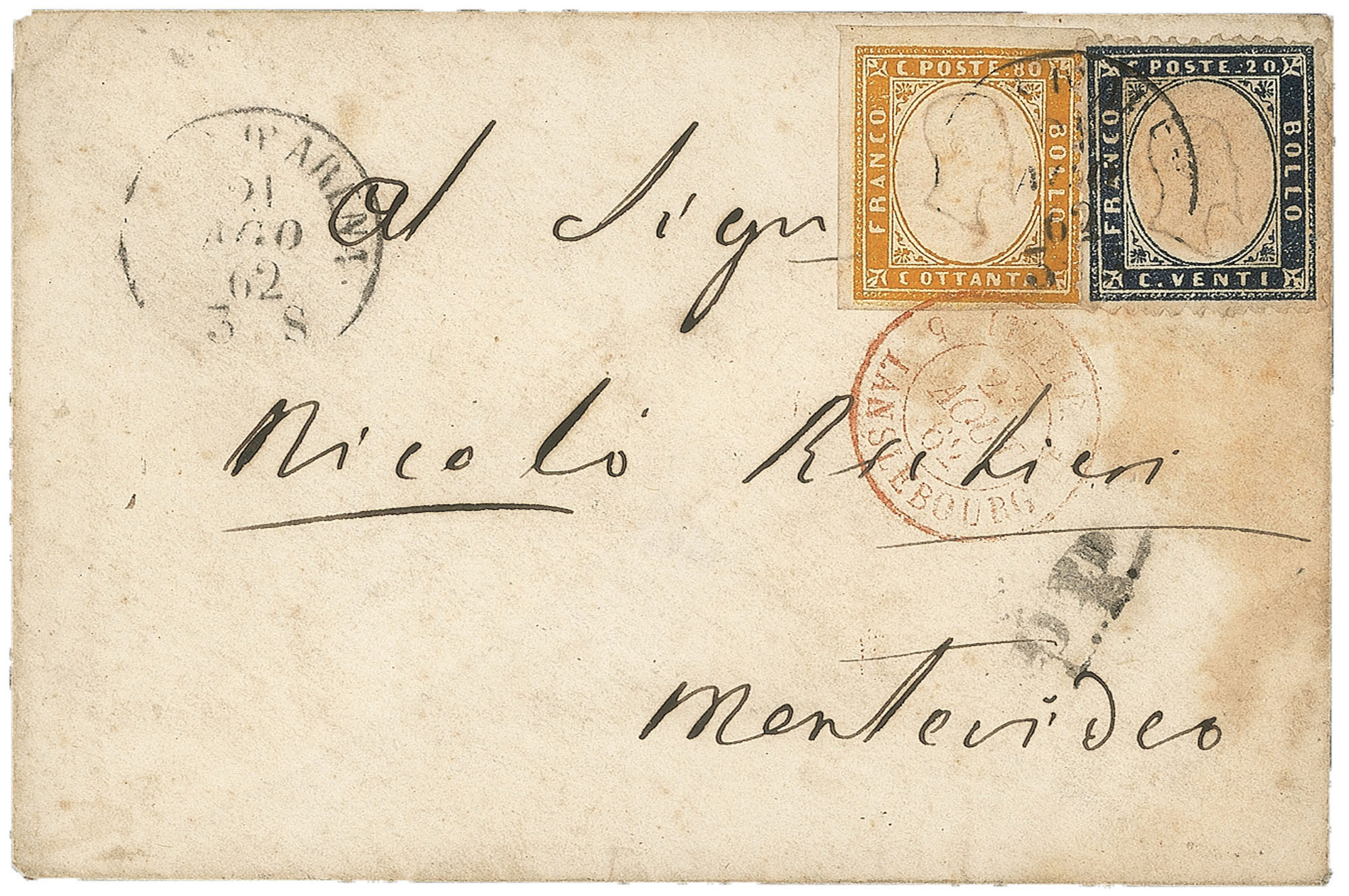 Prefilateliche - Bustina (17D + 2)Bustina con affrancatura mista Sardegna 80 cent arancio carico + Regno 20 cent indaco (17D + 2) da S.Pier d'Arena 21 AGO 62 per Montevideo con a lato il bollo P.P. e al verso bollo ambulante - non comune
