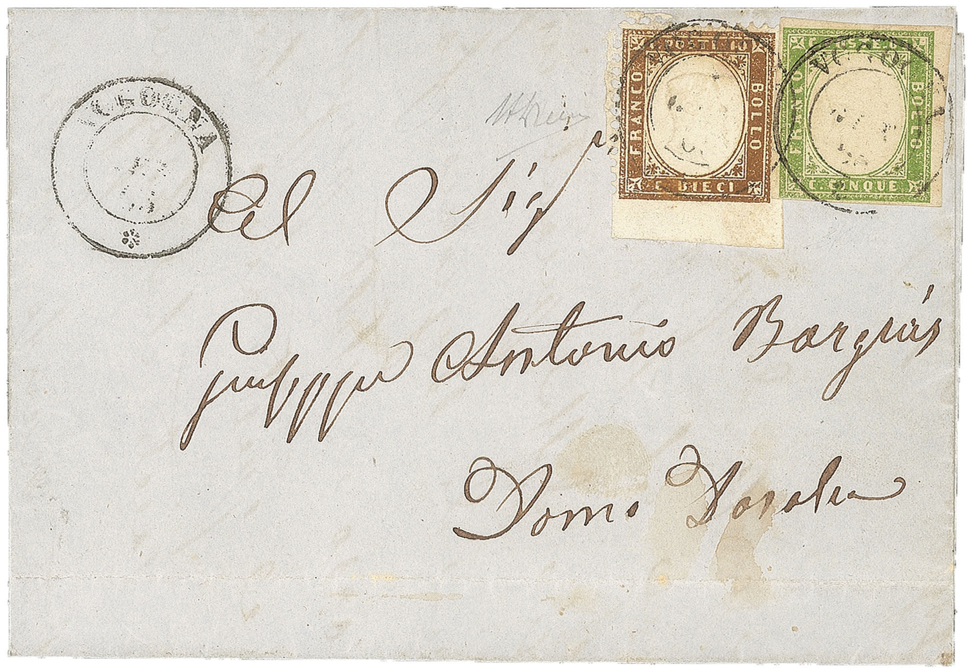 Prefilateliche - Lettera (13Ad)Lettera con affrancatura mista composta da Sardegna 5 cent verde giallo (13Ad) in uso tardivo + Regno 10 cent bruno scuro (1k) non dentellato in basso - da Vogogna 6 GEN.63 per Domodossola - cert. Alberto Diena