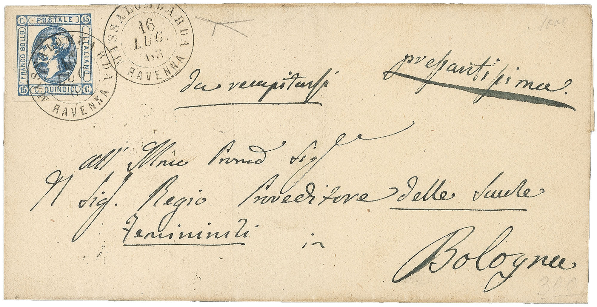 Prefilateliche - Lettera (13e)Lettera affrancata con 15 cent litografico (13e) con parziale doppia stampa da slittamento (tassello superiore) - da Massalombarda 16 LUG. 63 per Bologna - cert. Bottacchi