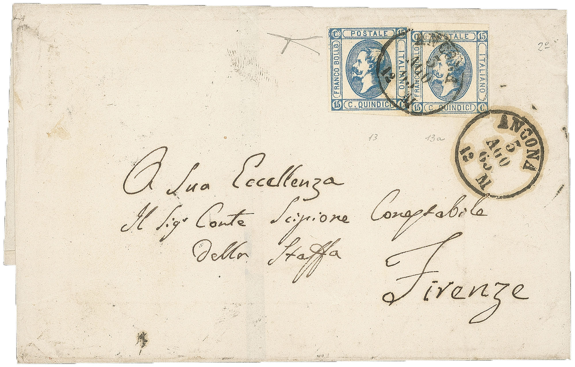 Prefilateliche - Lettera (13 varietà)Lettera affrancata con 15 cent litografico azzurro (13 varietà) con doppia stampa da slittamento (angolo superiore sinistro) + 15 cent litografico azzurro chiaro (13a) da Ancona 5 AGO 63 per Firenze - cert. Bottacchi