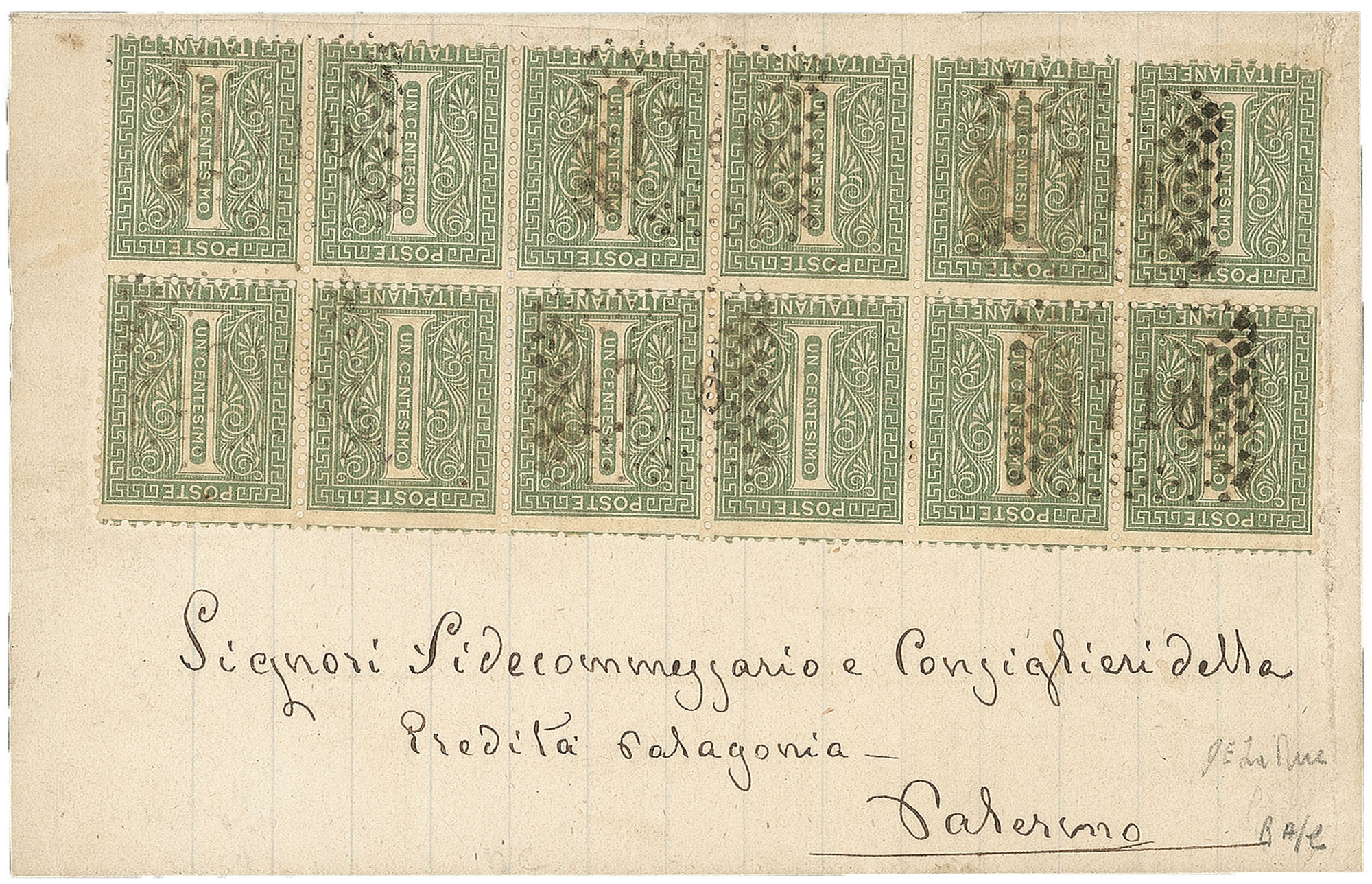 Prefilateliche - Blocco di dodici (L14)Blocco di dodici esemplari del 1 cent verde oliva (L14) su involucro di piego diretto a Palermo annullato con il numerale a punti 1716 di Piedimonte Etneo - raro multiplo
