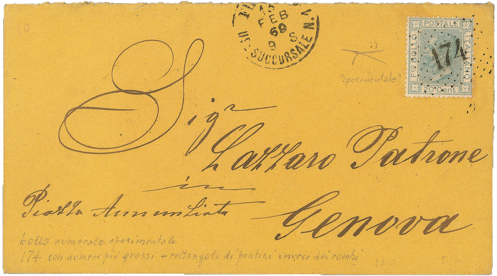 Prefilateliche - Busta (L26)Busta affrancata con 20 cent VE II DLR (L26) con annullo sperimentale numerale a punti 174 di Firenze - due noti