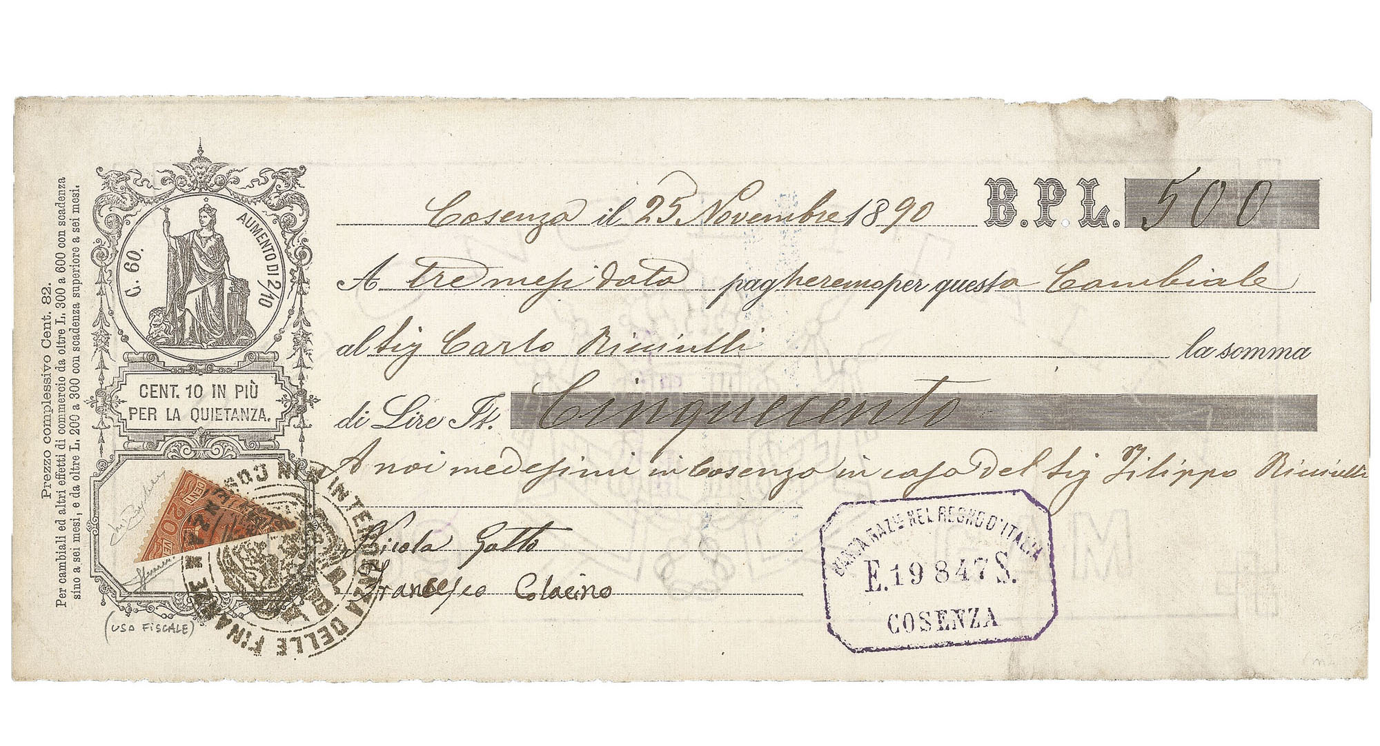 Prefilateliche - 20 cent (61)20 cent arancio Umberto I (61) frazionato in diagonale e utilizzato fiscalmente su cambiale del 25 novembre 1890 con annullo amministrativo dell'Intendenza di Finanza di Cosenza - rarità - firme Sorani + Raybaudi