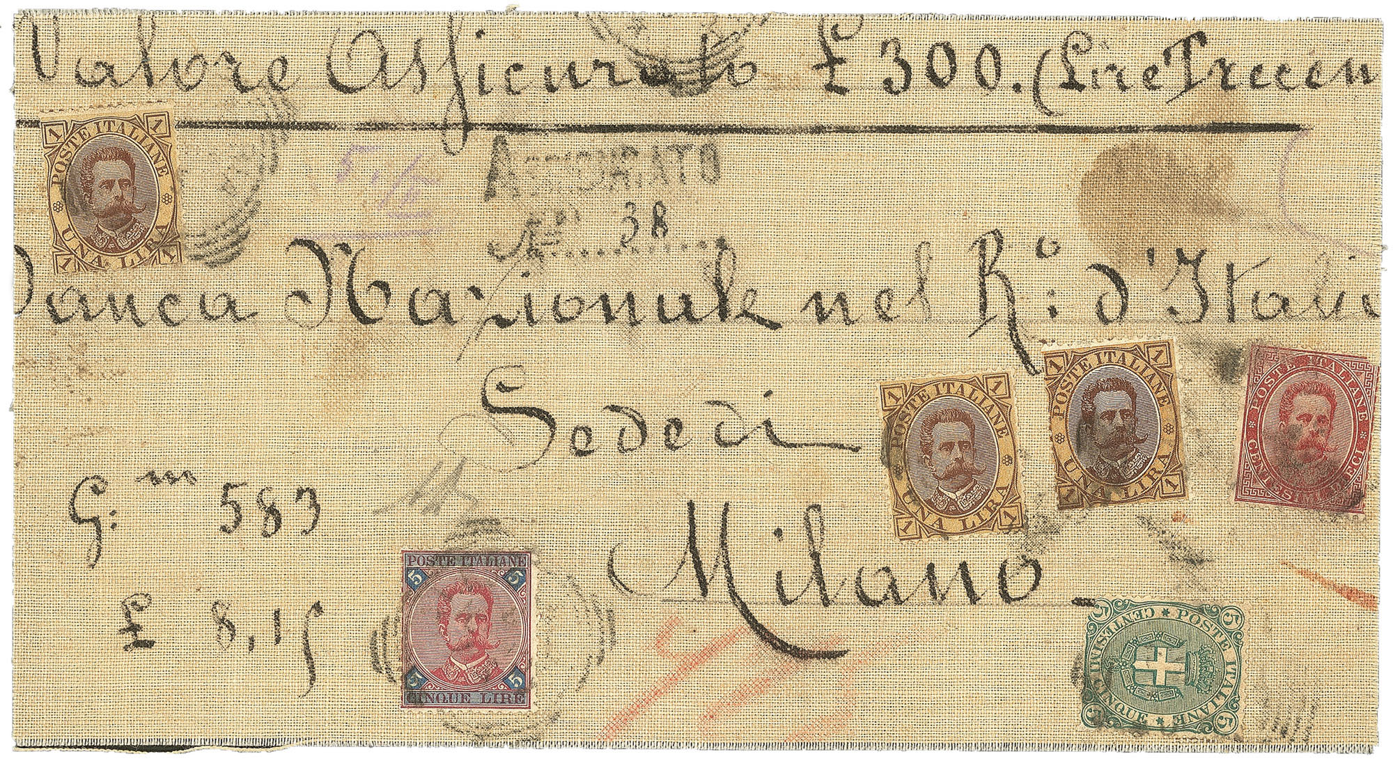 Prefilateliche - Frontespizio di bustaFrontespizio di busta telata affrancato per 8,15 lire e assicurato per 300 lire diretto a Milano - tariffa da 39 porti assicurati con affrancatura quadricolore - esatta tariffa - presenti alcuni difetti come sempre su questi frontespizi