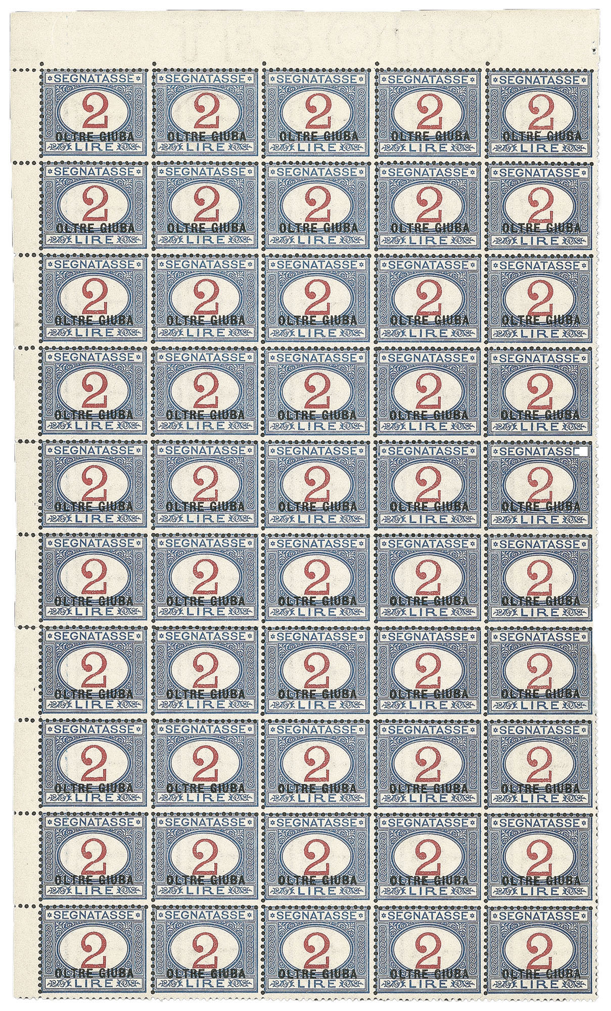 Colonie - Oltre Giuba - 1925 - 2 lire segnatasse soprastampati (9)2 lire segnatasse soprastampati (9) - blocco di 50 esemplari angolo di foglio alto a sinistra - gomma integra