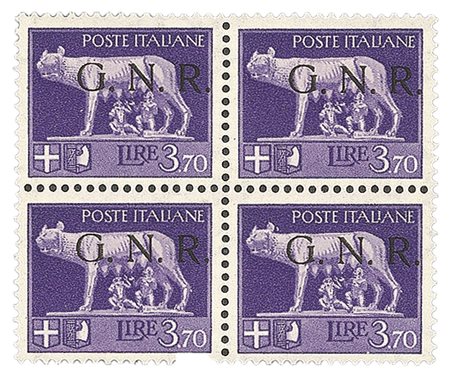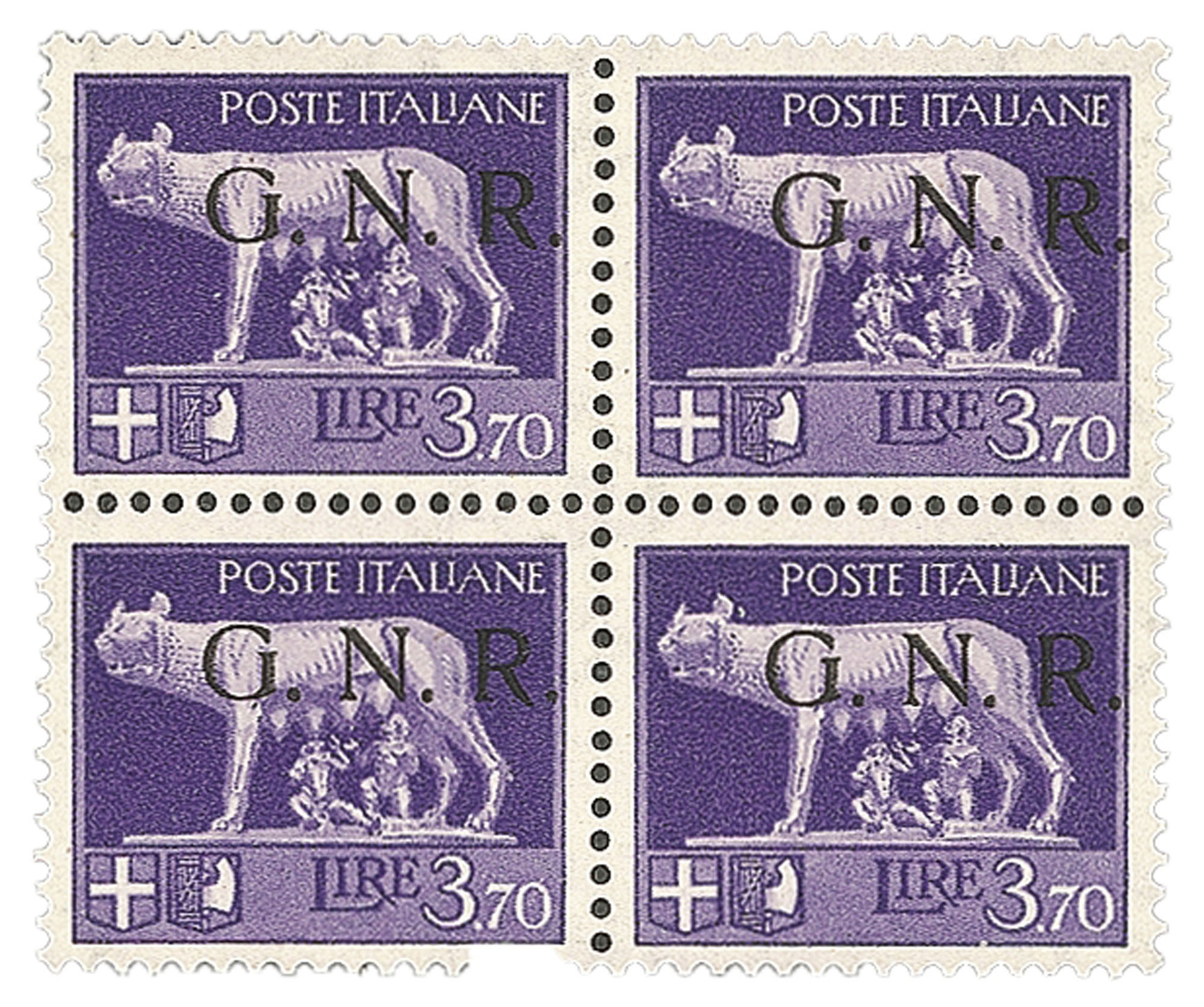 RSI - G.N.R. Brescia - 1943 - 3,70 lire (484/Ihcc)3,70 lire (484/Ihcc) in quartina (posiz. 23/34) - soprastampe spostate - gomma integra - Fiecchi + cert. Sirotti