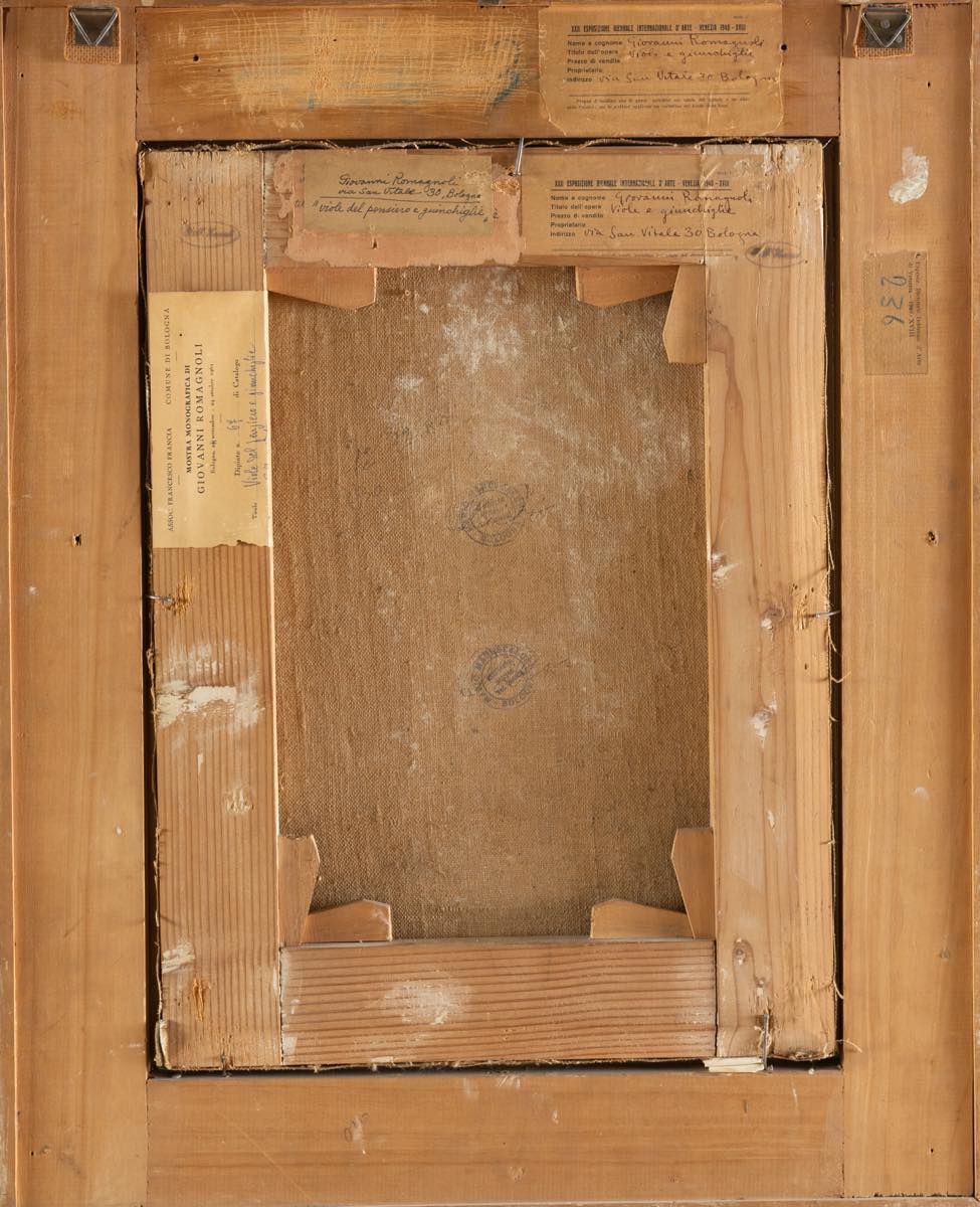 Giovanni Romagnoli (Faenza 1893 – Bologna 1976), "Viole del pensiero e giunchiglie". Olio su tela, firmato in alto a sinistra, reca al retro timbri della Galleria Marescalchi – Bologna e della Collezione Privata Zaccardi – Bologna ed etichette con autore e titolo della Mostra Monografica di Giovanni Romagnoli – Bologna con n. 67, e della XXII Esposizione Biennale Internazionale d’Arte – Venezia 1940 con n. 236, H cm 46.5x34 Esposizioni: Associazione Francesco Francia, “Mostra Monografica di Giovanni Romagnoli” – Bologna, 24 Settembre – 29 Ottobre 1961; XXII Esposizione Biennale Internazionale d’Arte – Venezia 1940.