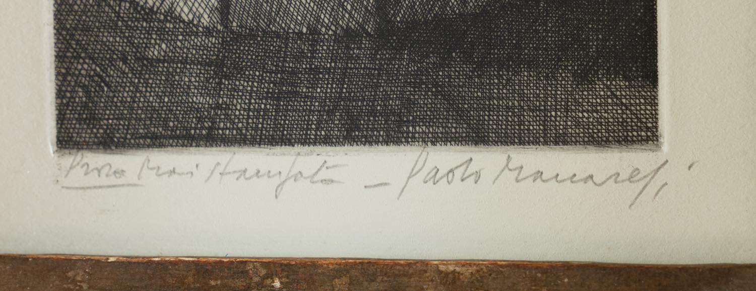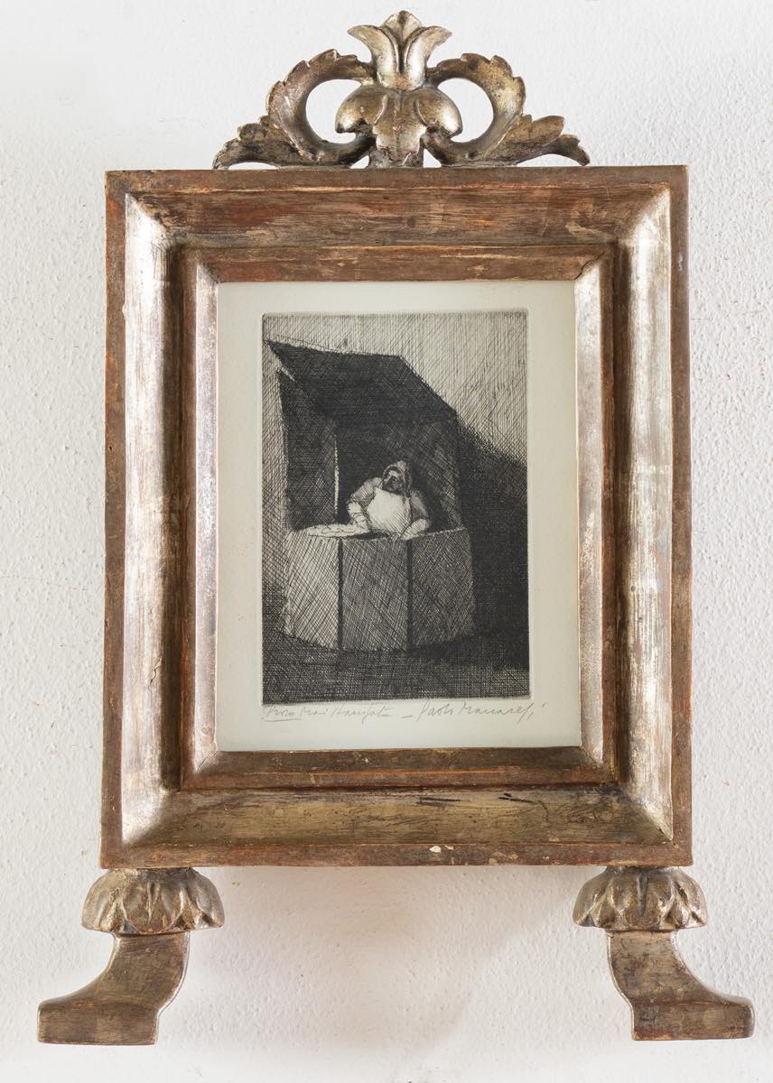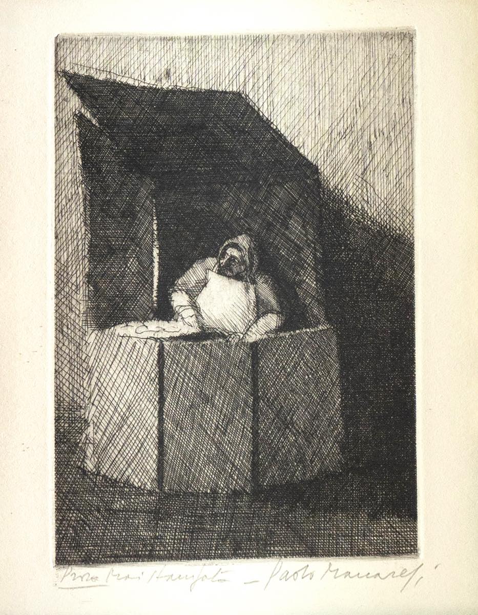 Paolo Manaresi (Bologna 1908 - 1991), "La mistocchinaia". Acquaforte su carta, firmata in basso a destra, esemplare in basso a sinistra prova mai stampata, reca al retro sulla cornice timbri della Collezione Zaccardi – Bologna, Lastra H cm 15.5x10.5 Provenienza: Collezione Privata Zaccardi – Bologna.