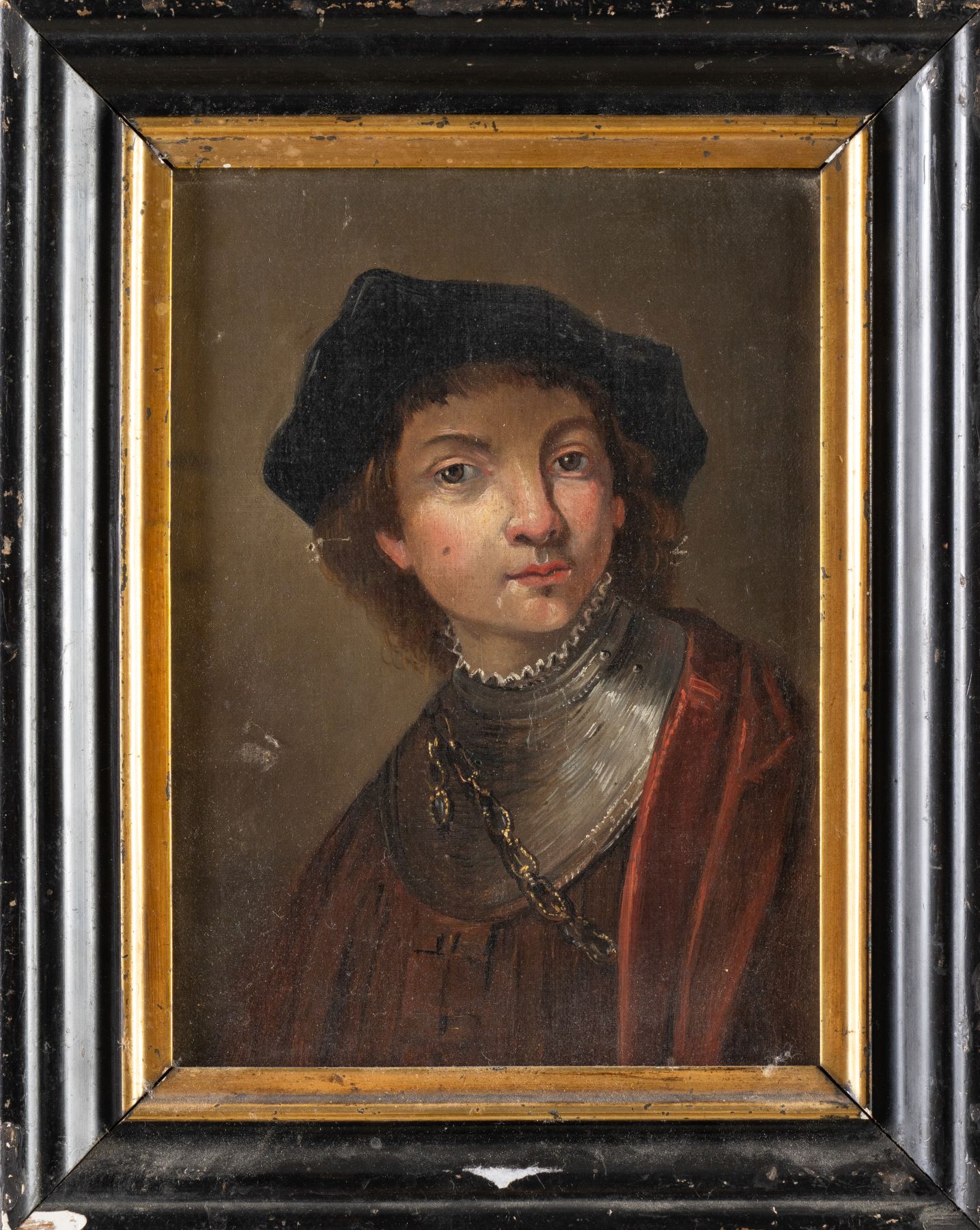 Maestro del XVIII secolo. Autoritratto giovanile di Rembrandt van Rijn (copia da). Olio su tela. Cm. 24x18.