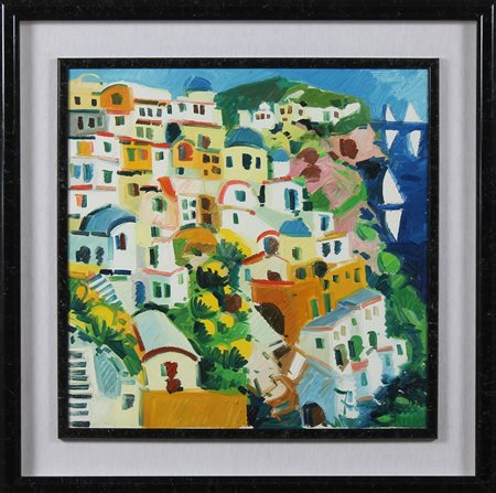 FACCINCANI ATHOS (n. 1951) Positano. Olio su tela . Cm 50,00 x 50,00. Firma in basso a destra. Certificato di autenticità e provenienza Edizioni d'Arte Monforte, Milano. Cornice presente