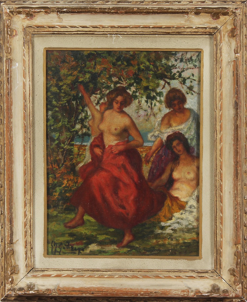 GONZAGA GIOVAN FRANCESCO (1921 - 2007) Le Baccanti in Arcadia. 1952. Olio su cartone telato. Cm 40,00 x 30,00. Firma in basso a sinistra. Al retro firma, data e titolo. Cornice presente