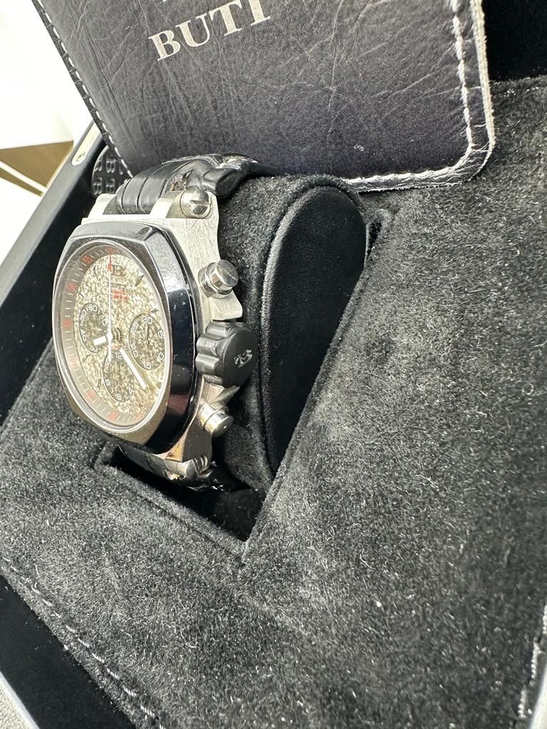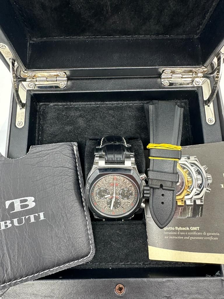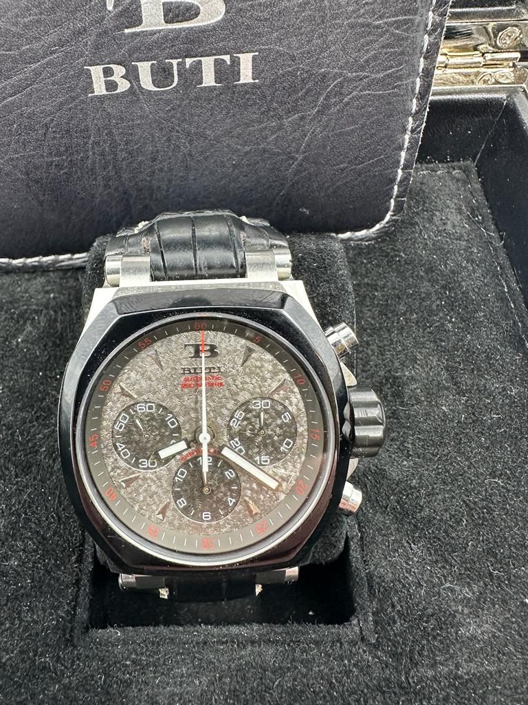 Marca TB Buti Numero di referenza yanick sport Carica Automatico Materiale della cassa acciaio / Titanio Materiale cinturino Pelle Corredo scatola originale e documenti originali Diametro 44 mm Materiale lunetta Titanio Materiale cinturino Pelle Colore cinturino Nero Chiusura Chiusura ad ardiglione Materiale chiusura Acciaio Funzioni Cronografo