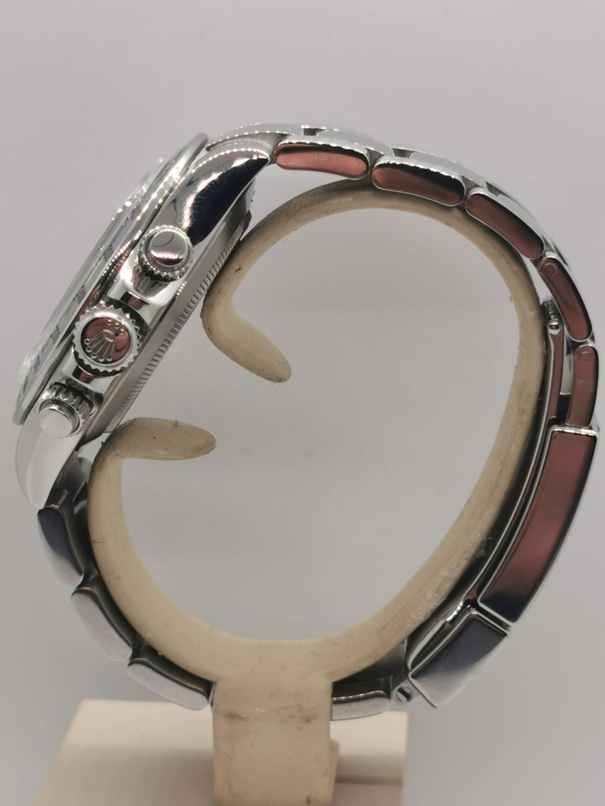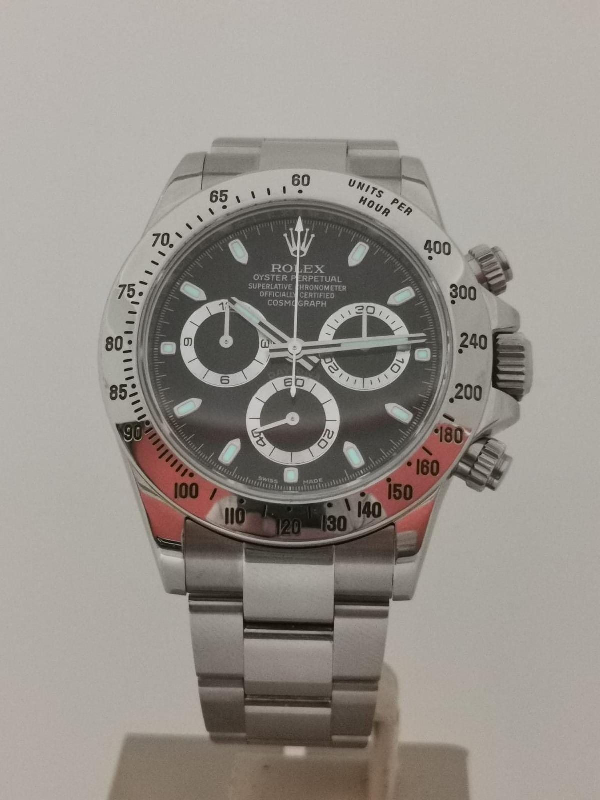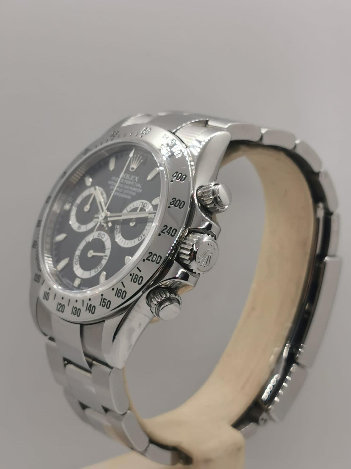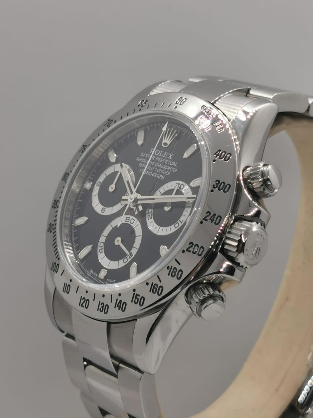 Marca Rolex Modello (Orologio) Daytona Numero di referenza 116520 Carica Automatico Materiale della cassa Acciaio Materiale cinturino Acciaio Condizione Ottimo (di seconda mano, segni di usura assenti o appena visibili), anno 2007/08 Corredo documenti originali , no box Calibro Carica Automatico Cassa Materiale della cassa Acciaio Diametro 40 mm Impermeabile 10 ATM Materiale lunetta Acciaio Vetro Vetro zaffiro Quadrante Nero Numeri sul quadrante Senza numeri Cinturino Materiale cinturino Acciaio Colore cinturino Acciaio Chiusura Déployante Materiale chiusura Acciaio Funzioni Cronografo