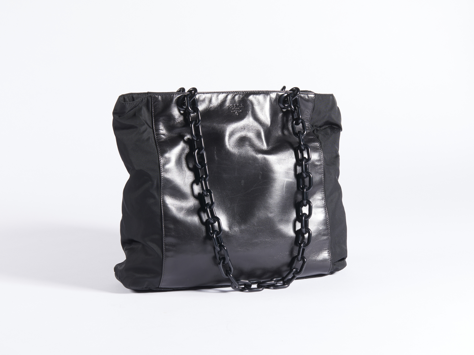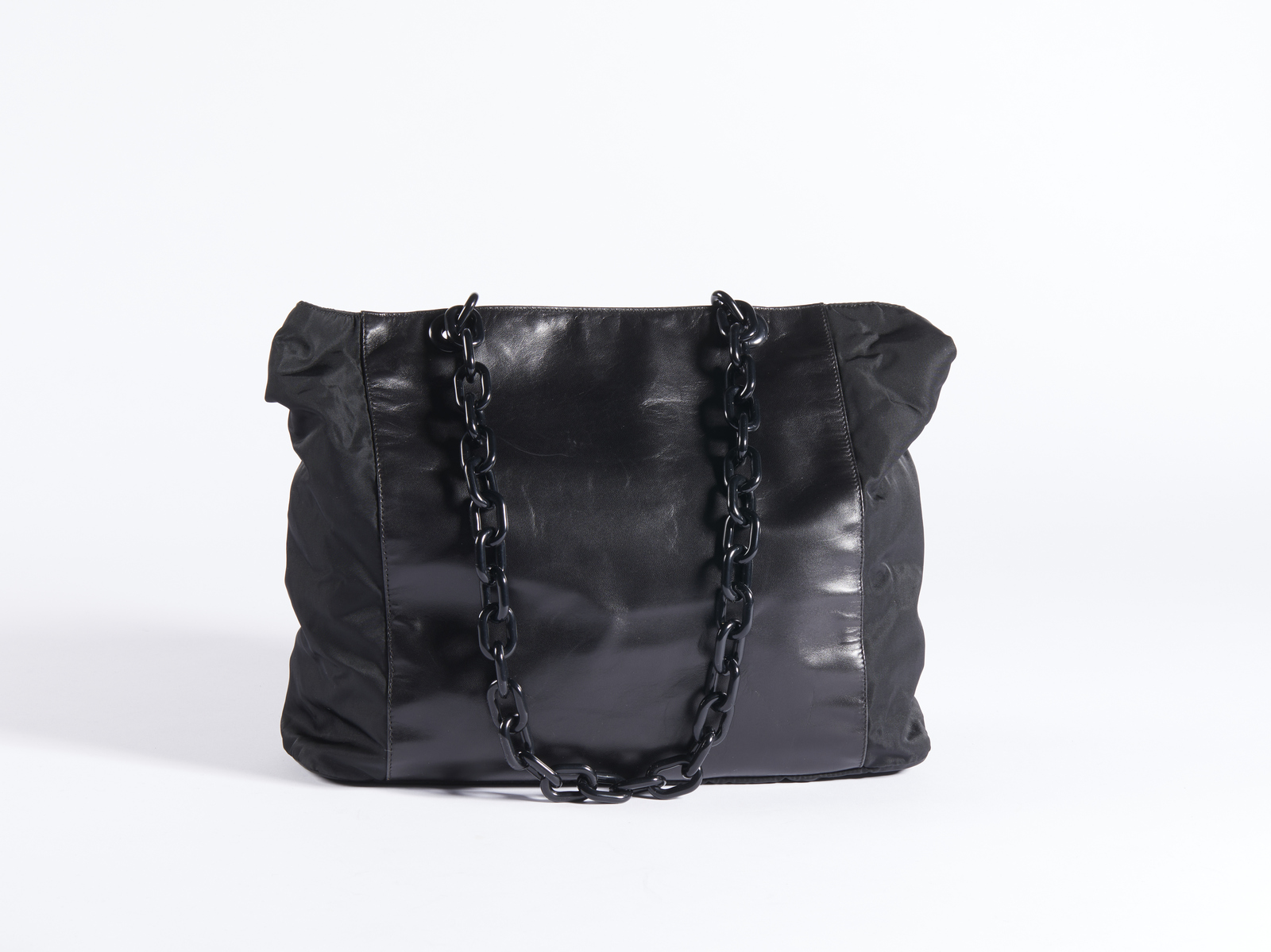 PRADA MILANO Borsa in tessuto nero. acrilico su tessuti apprettati. Cm 30,00 x 34,00 x 10,00. Borsa in tessuto tecnico nero e frontale di pelle nera. I manici sono in plastica con catena color nero. Internamente tessuto tecnico e tasca portaoggetti con lampo e logo Prada.