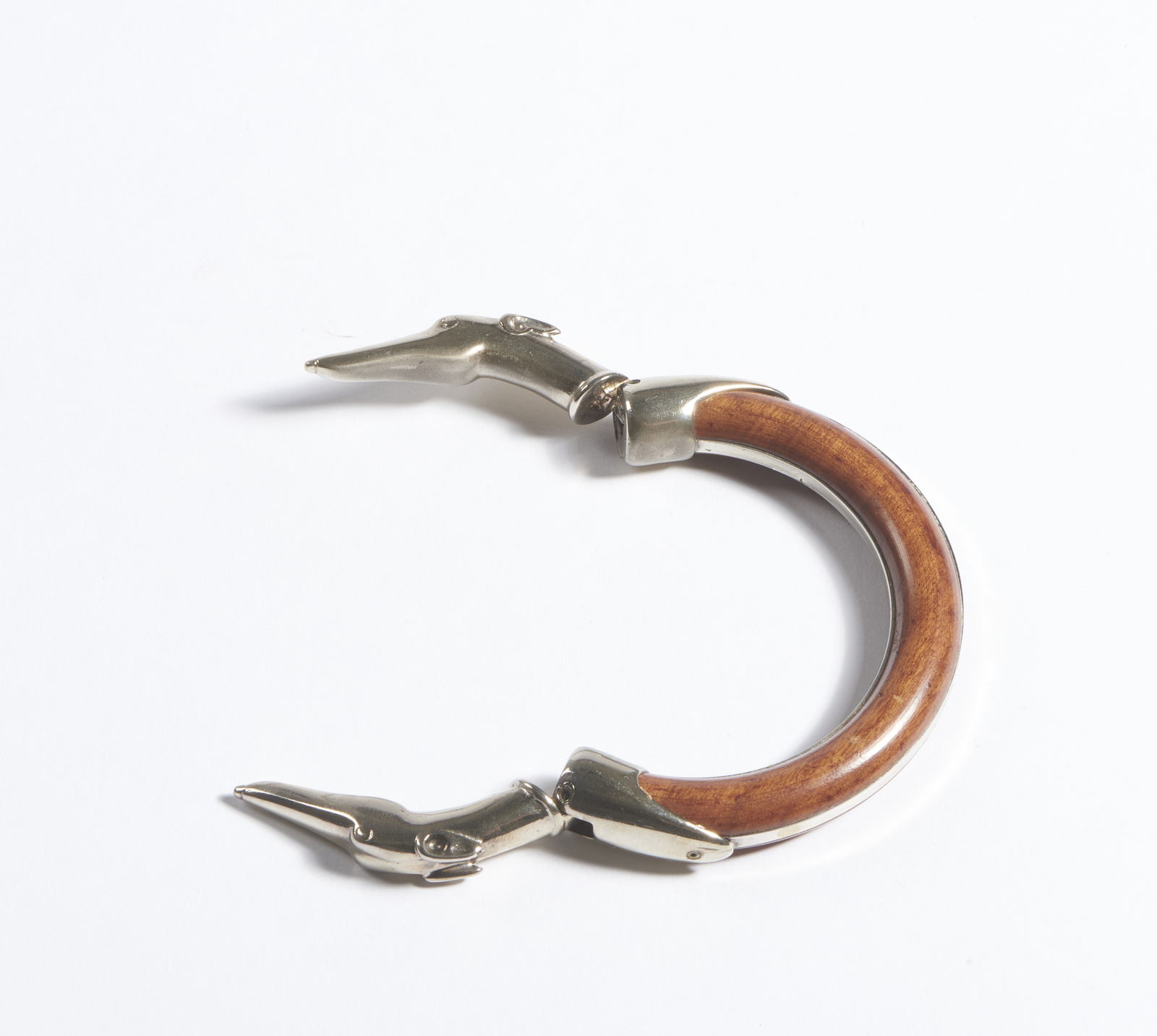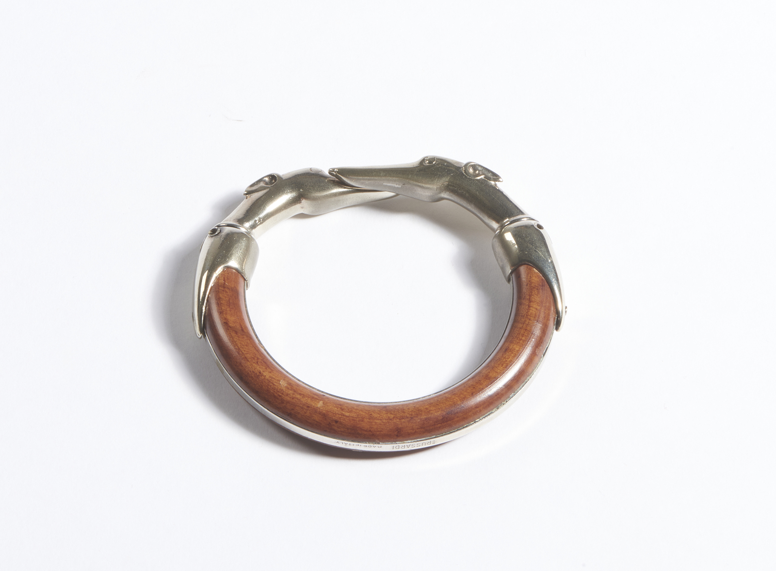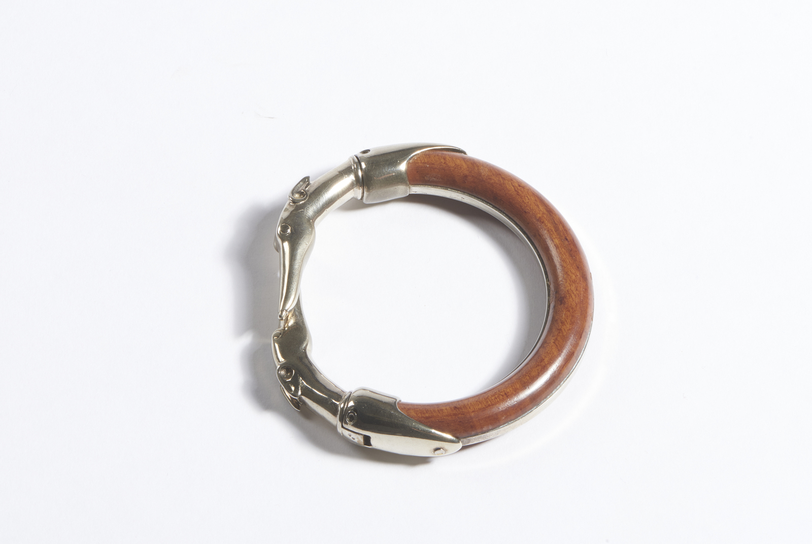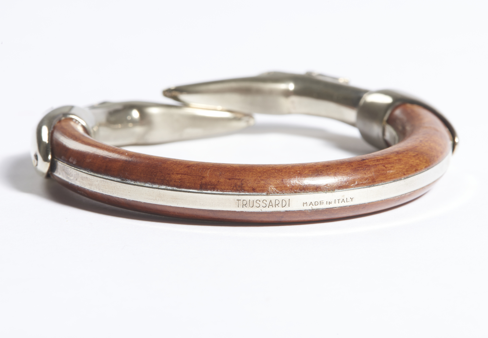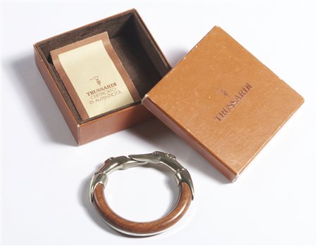 TRUSSARDI (n. 1911) Bracciale. Legno e metallo.. . Bracciale in legno e metallo raffigurante nella chiusura due teste di levriero.