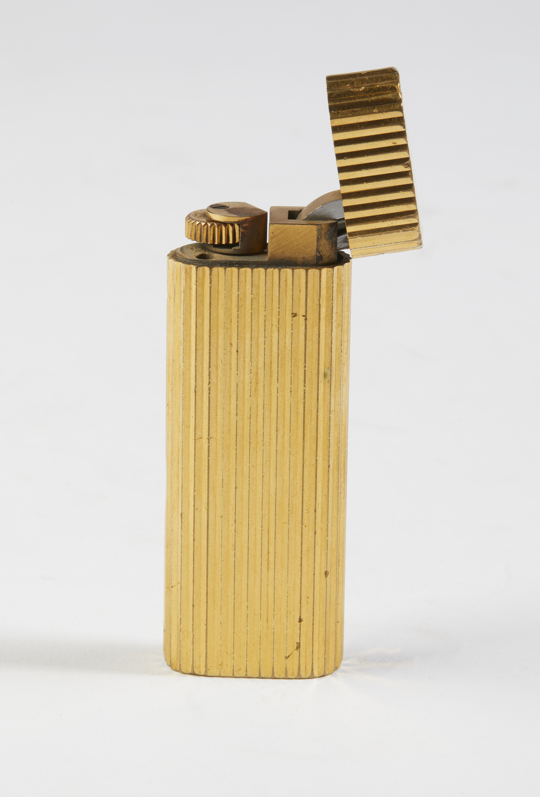 CARTIER Accendino placcato oro. Metallo dorato.. Cm 2,80 x 7,00. Accendino da tasca Cartier in metallo placcato oro, forma rettangolare, rigato, firma incisa alla base.