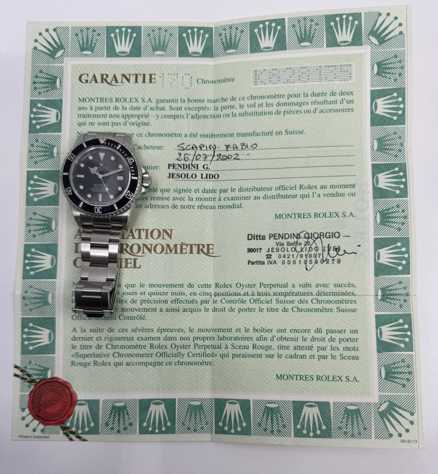 Marca Rolex Modello (Orologio) Sea-Dweller Numero di referenza 16600 Carica Automatico Materiale della cassa Acciaio Materiale cinturino Acciaio Anno 2002, Condizione Ottimo (di seconda mano, segni di usura assenti o appena visibili) Corredo documenti originali Rolex, no box Cassa Materiale della cassa Acciaio Diametro 40 mm Impermeabile Oltre i 120 ATM Materiale lunetta Acciaio Vetro Vetro zaffiro Quadrante Nero Numeri sul quadrante Senza numeri Cinturino Materiale cinturino Acciaio Colore cinturino Acciaio Chiusura Déployante Materiale chiusura Acciaio Funzioni Data