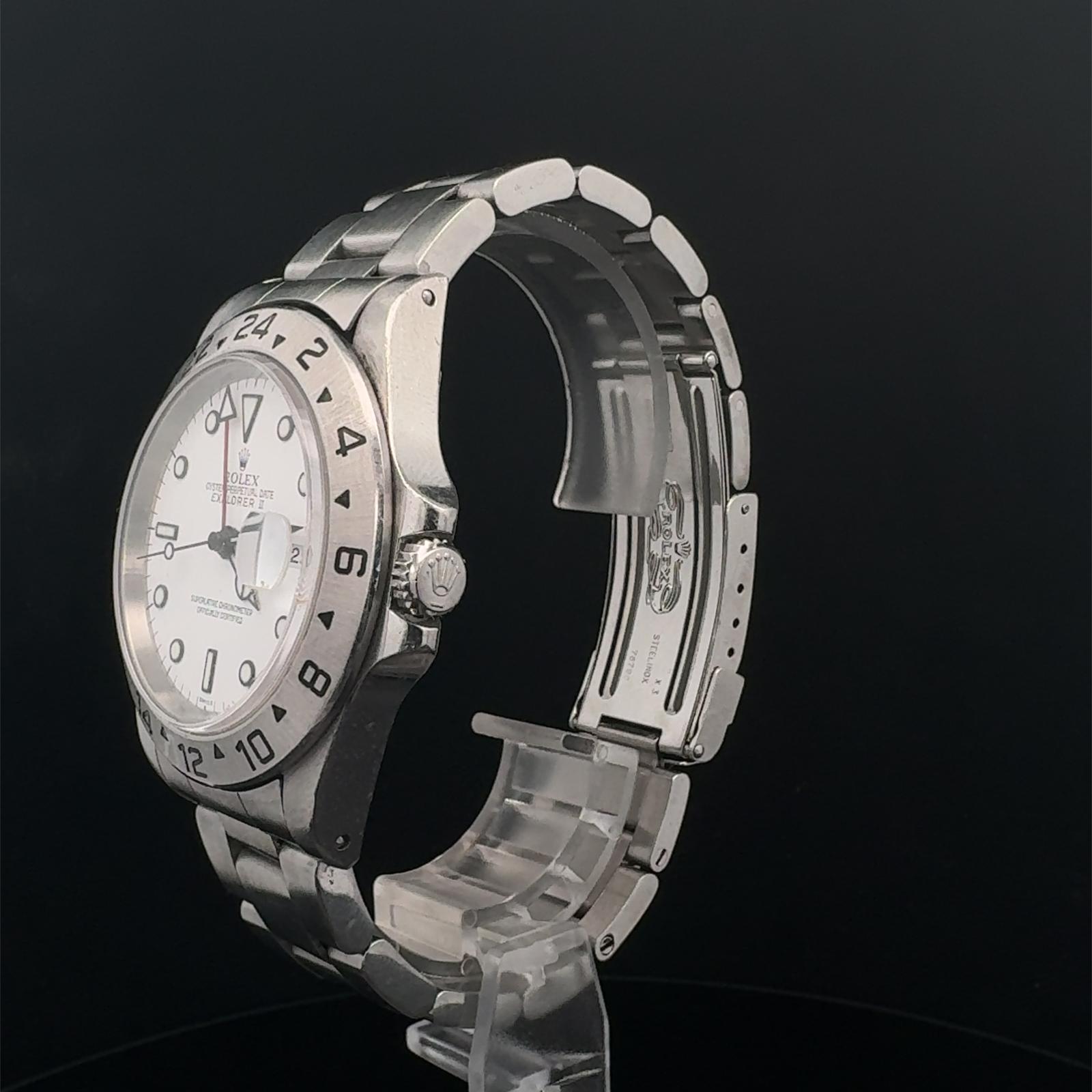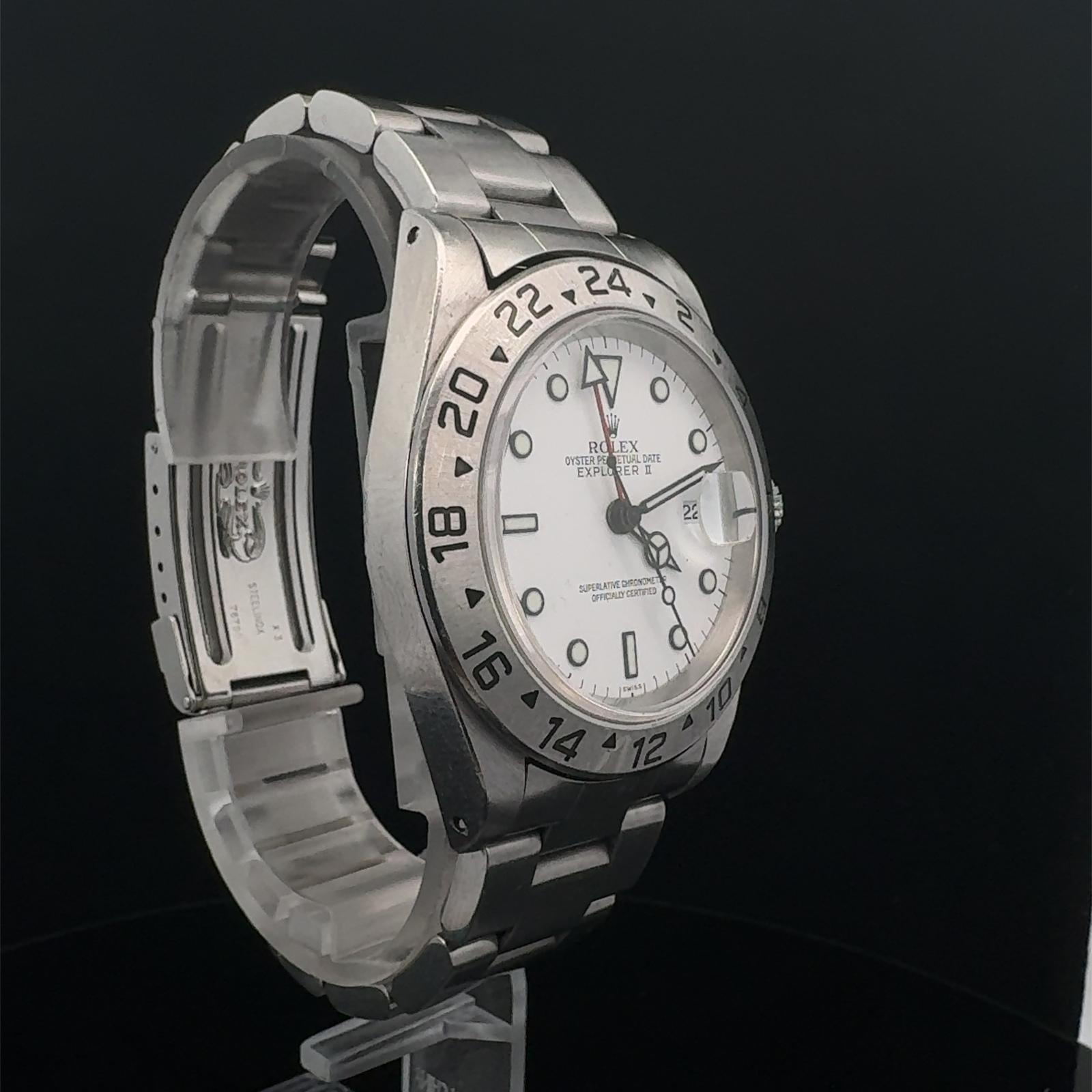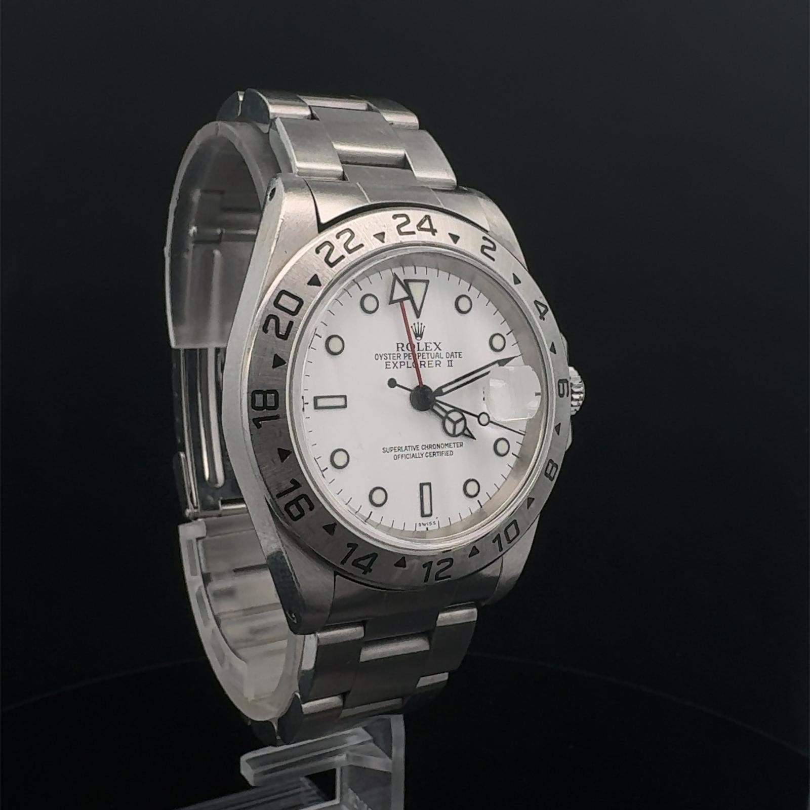 Marca Rolex Modello (Orologio) Explorer II Numero di referenza 16570 Carica Automatico Materiale della cassa Acciaio Materiale cinturino Acciaio Anno di produzione 2000 Corredo documenti originali Rolex, no box Calibro Carica Automatico Materiale della cassa Acciaio Diametro 40 mm Impermeabile 10 ATM Materiale lunetta Acciaio Vetro Vetro zaffiro Quadrante Bianco Numeri sul quadrante Senza numeri Cinturino Materiale cinturino Acciaio Colore cinturino Acciaio Chiusura Déployante Materiale chiusura Acciaio