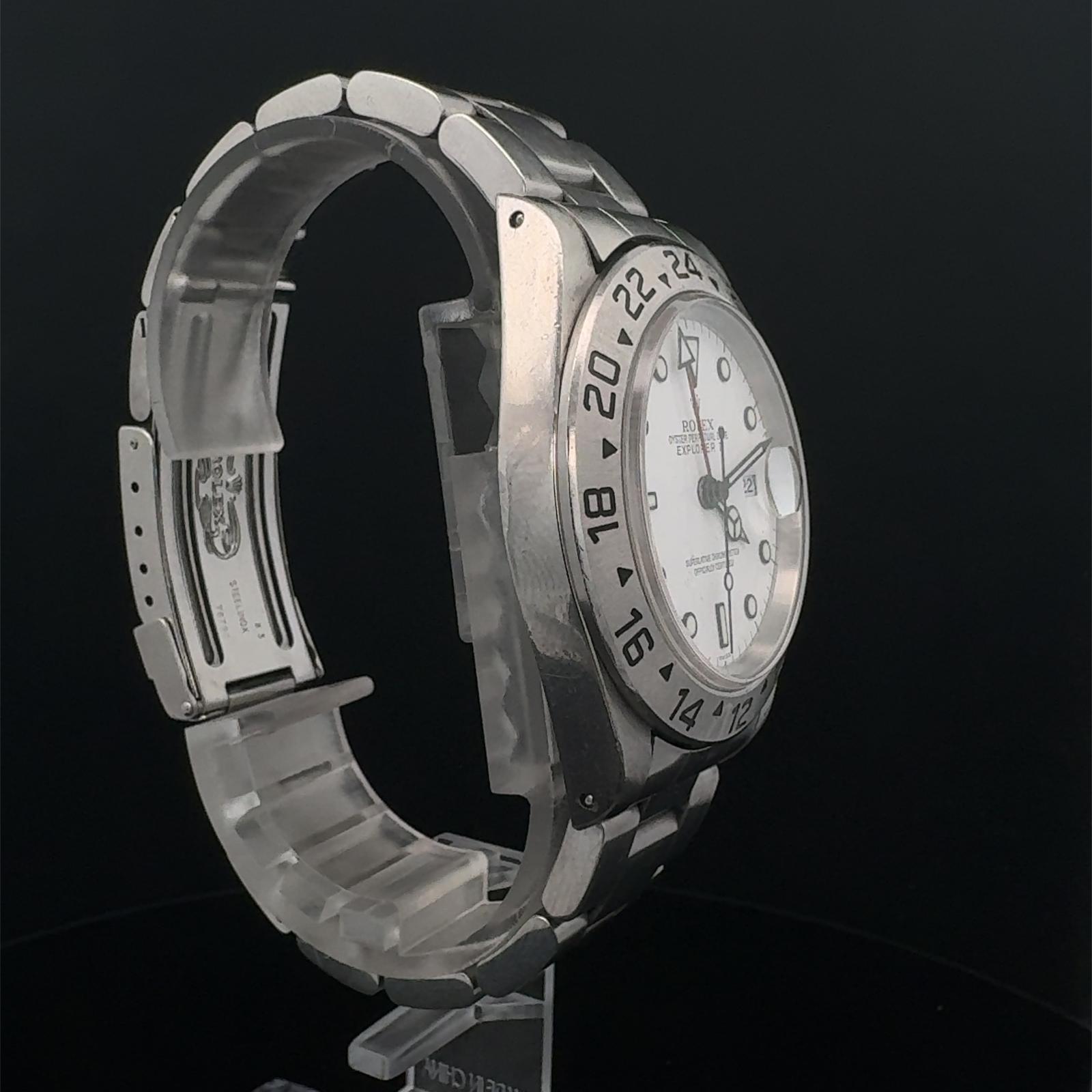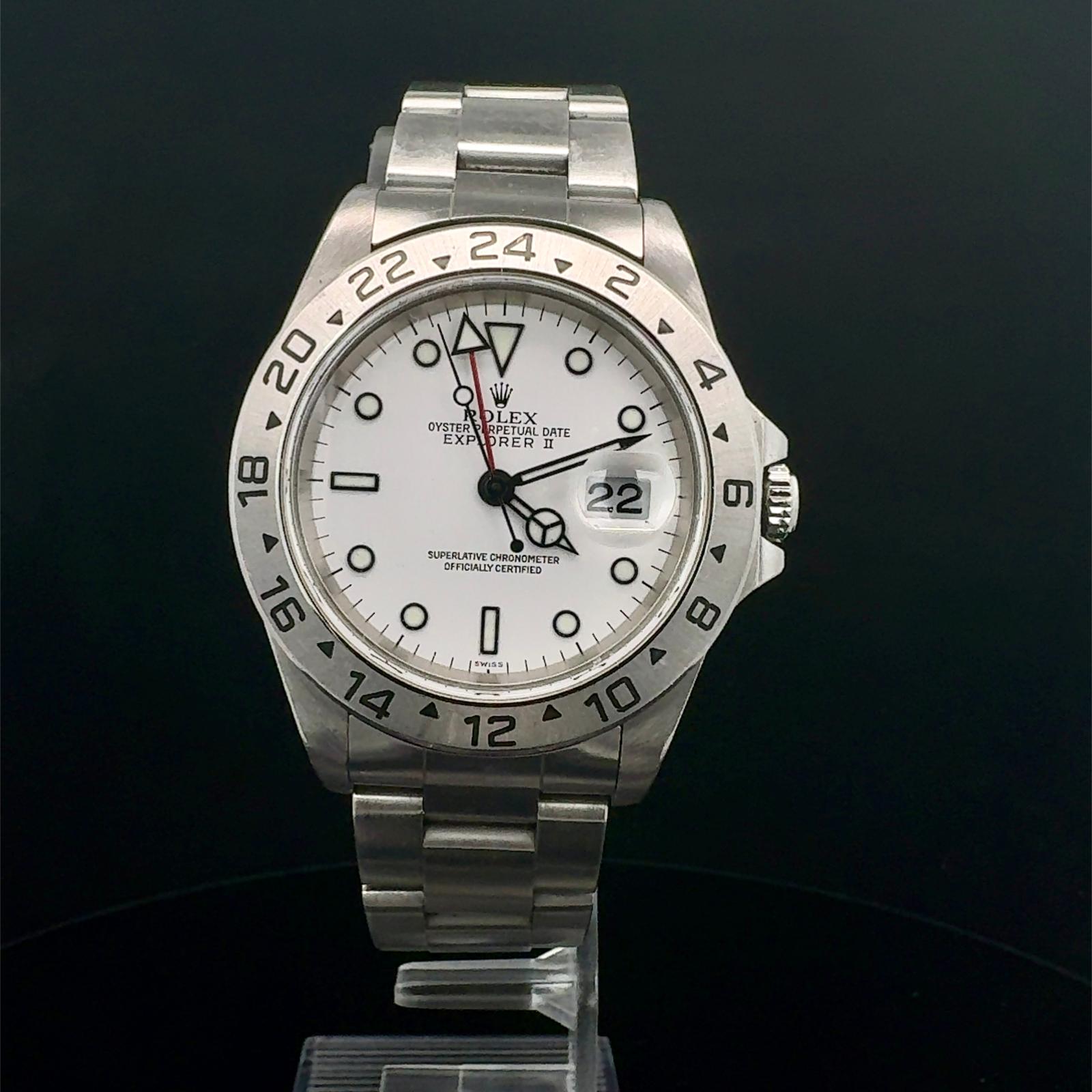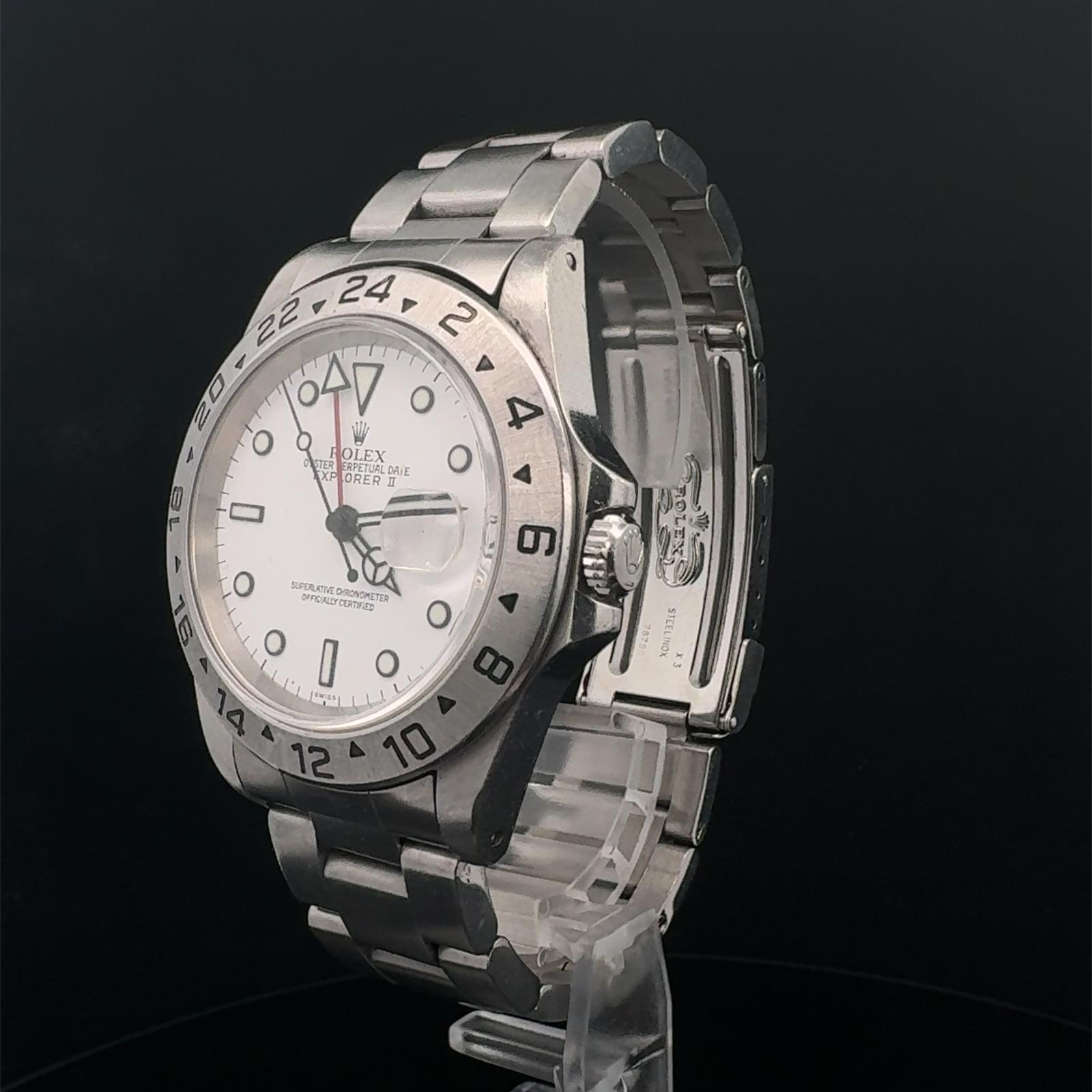 Marca Rolex Modello (Orologio) Explorer II Numero di referenza 16570 Carica Automatico Materiale della cassa Acciaio Materiale cinturino Acciaio Anno di produzione 2000 Corredo documenti originali Rolex, no box Calibro Carica Automatico Materiale della cassa Acciaio Diametro 40 mm Impermeabile 10 ATM Materiale lunetta Acciaio Vetro Vetro zaffiro Quadrante Bianco Numeri sul quadrante Senza numeri Cinturino Materiale cinturino Acciaio Colore cinturino Acciaio Chiusura Déployante Materiale chiusura Acciaio
