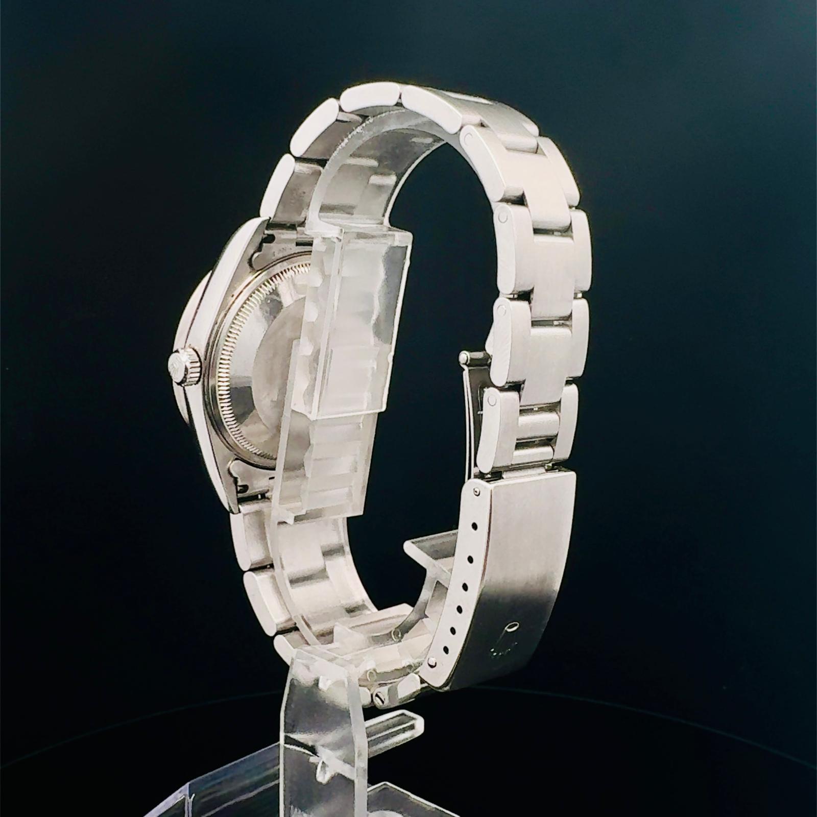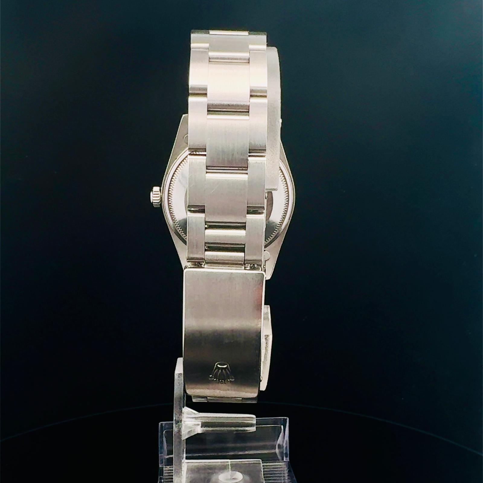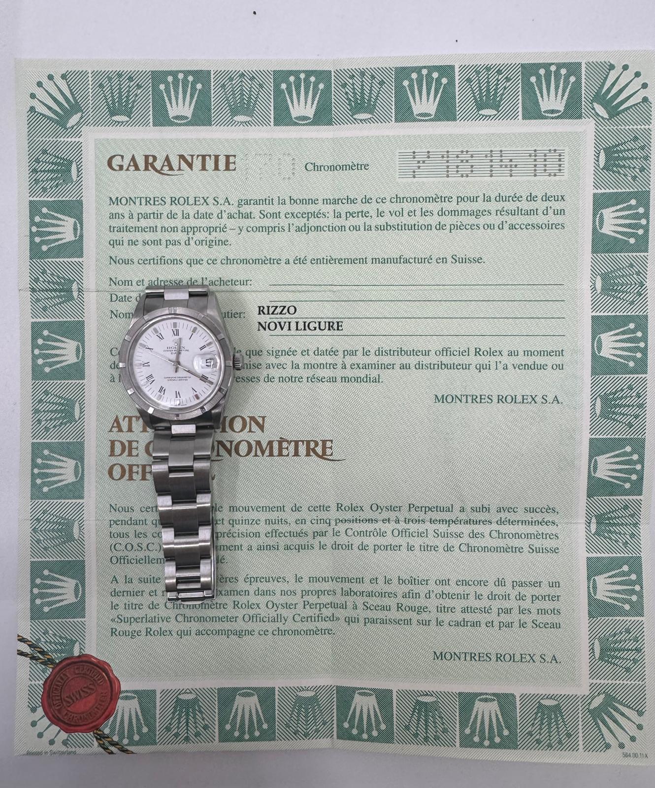 Marca Rolex Modello (Orologio) Oyster Perpetual Date Numero di referenza 15210 Carica Automatico Materiale della cassa Acciaio Materiale cinturino Acciaio Anno di produzione 2002 documenti originali, no box Carica Automatico Cassa Materiale della cassa Acciaio Diametro 34 mm Materiale lunetta Acciaio Vetro Vetro zaffiro Materiale cinturino Acciaio Chiusura Déployante Materiale chiusura Acciaio