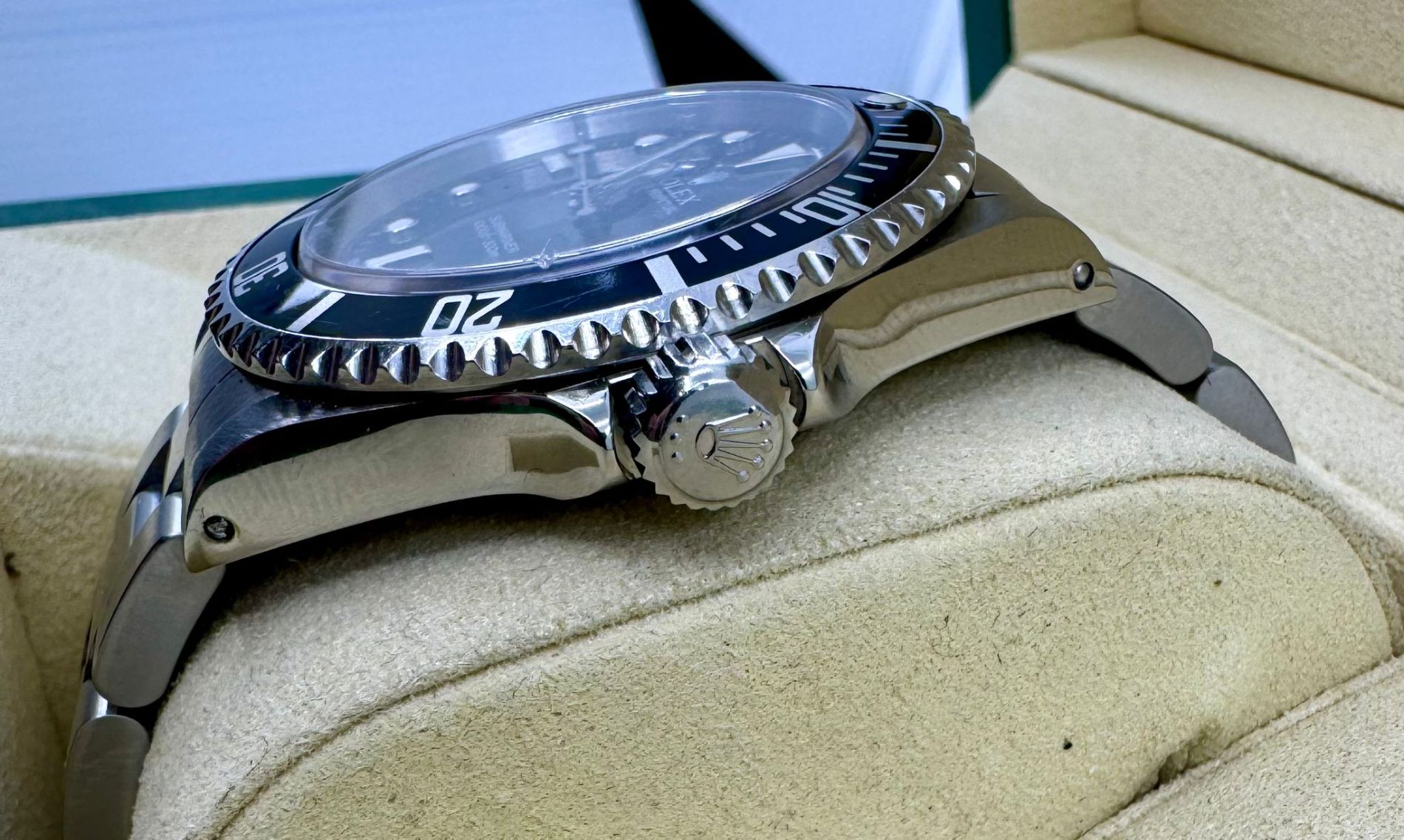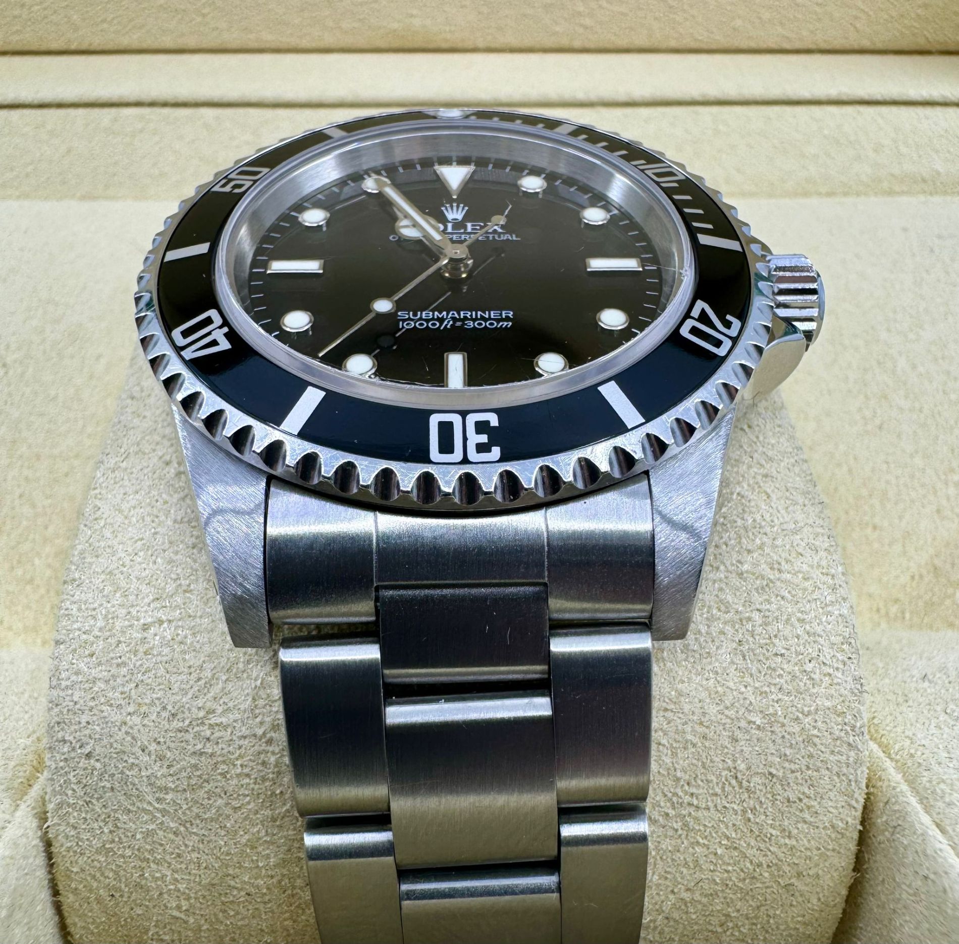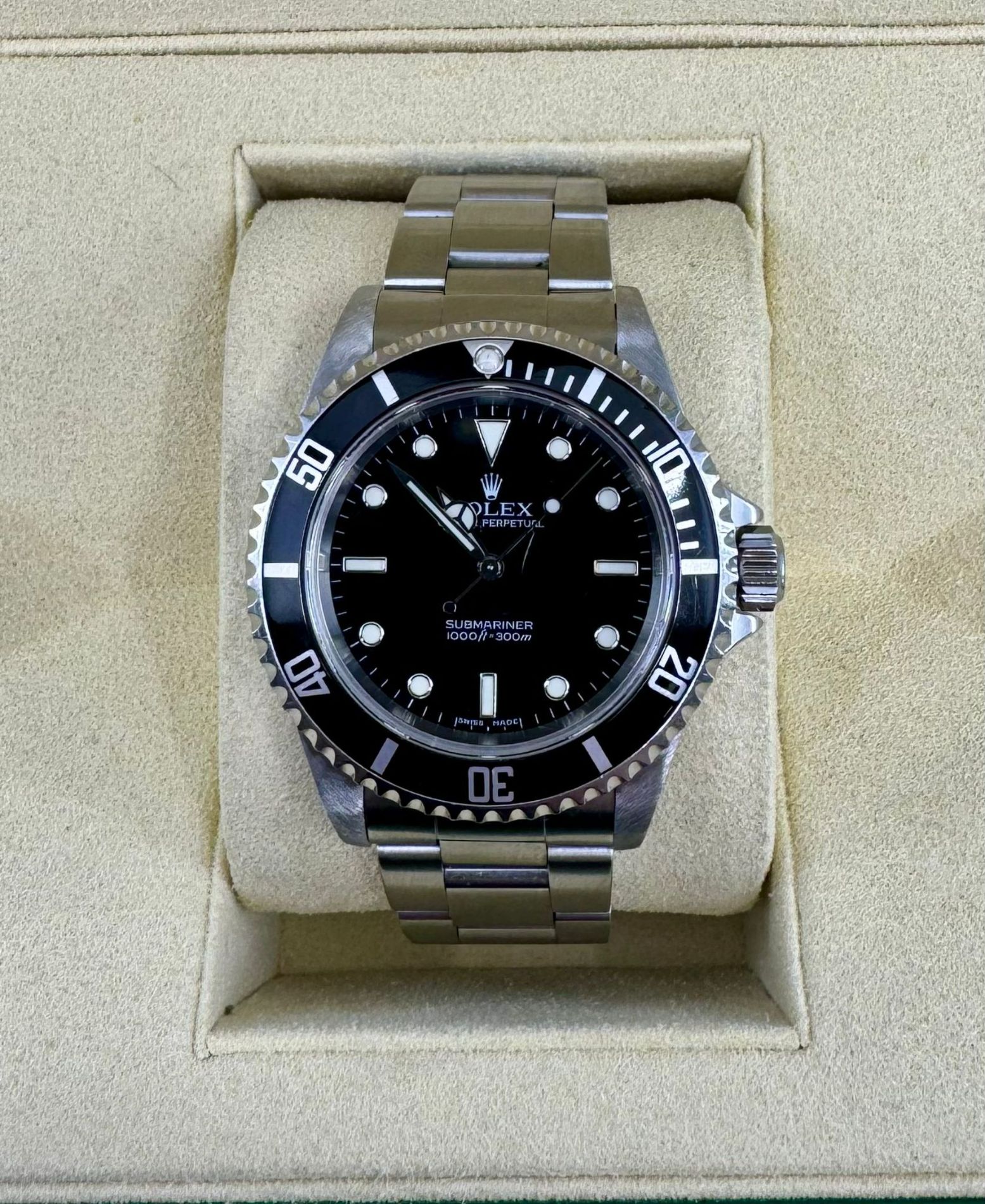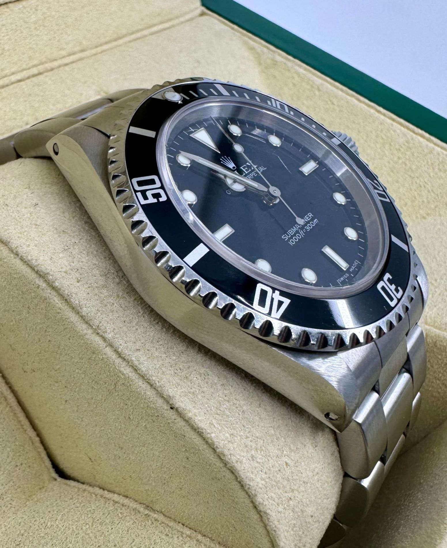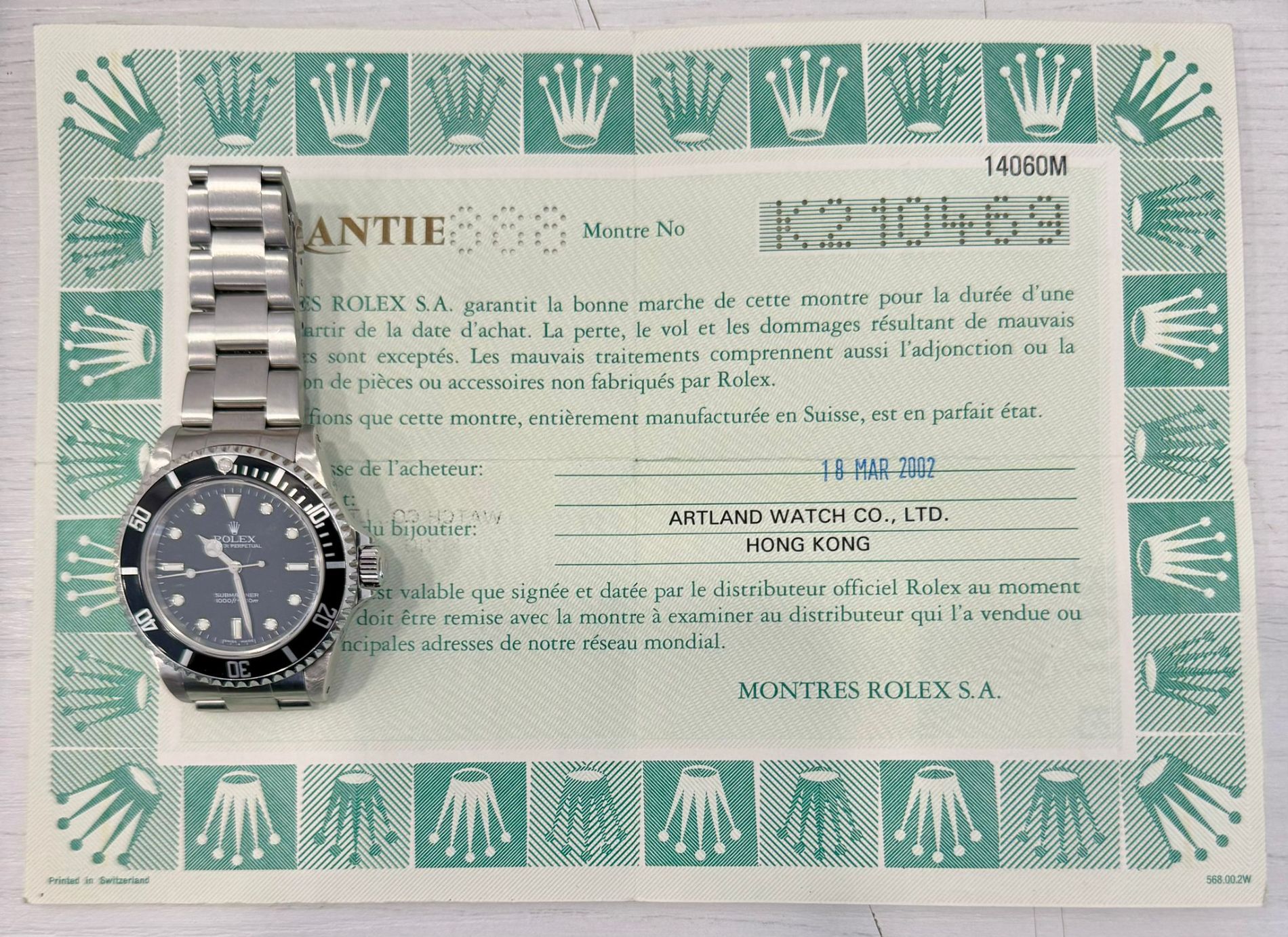 Marca Rolex Modello (Orologio) Submariner (No Date) Numero di referenza 14060M Carica Automatico Materiale della cassa Acciaio Materiale cinturino Acciaio Anno di produzione 2002 Condizione Ottimo (di seconda mano, segni di usura assenti o appena visibili) Corredo Con documenti originali, no box Materiale della cassa Acciaio Diametro 40 mm Impermeabile 30 ATM Materiale lunetta Acciaio Vetro Vetro zaffiro Quadrante Nero Numeri sul quadrante Senza numeri Cinturino Materiale cinturino Acciaio Colore cinturino Acciaio Chiusura Dèployante Materiale chiusura Acciaio