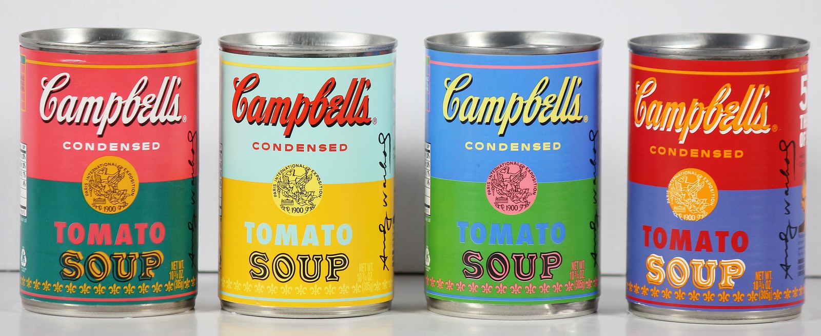 WARHOL ANDY (1928 - 1987) Cambells soup. Lotto composto da n. 4 confezioni di Toamato soup. Latta. Cm 7,00 x 10,00. Limited edition 50 Years the art of soup. Firma a stampa. Iconic artwork del 1962 di Andy Warhol's.