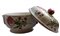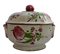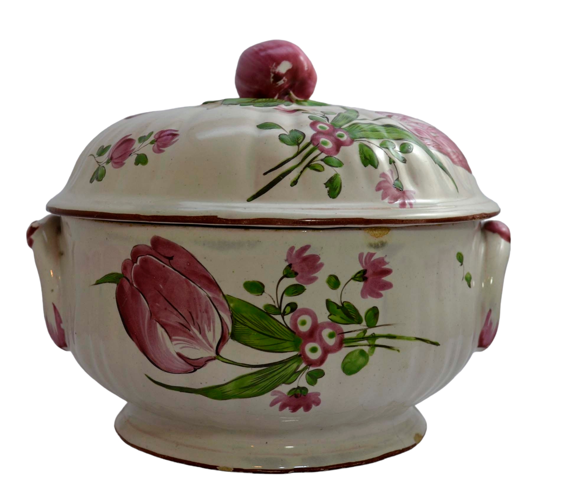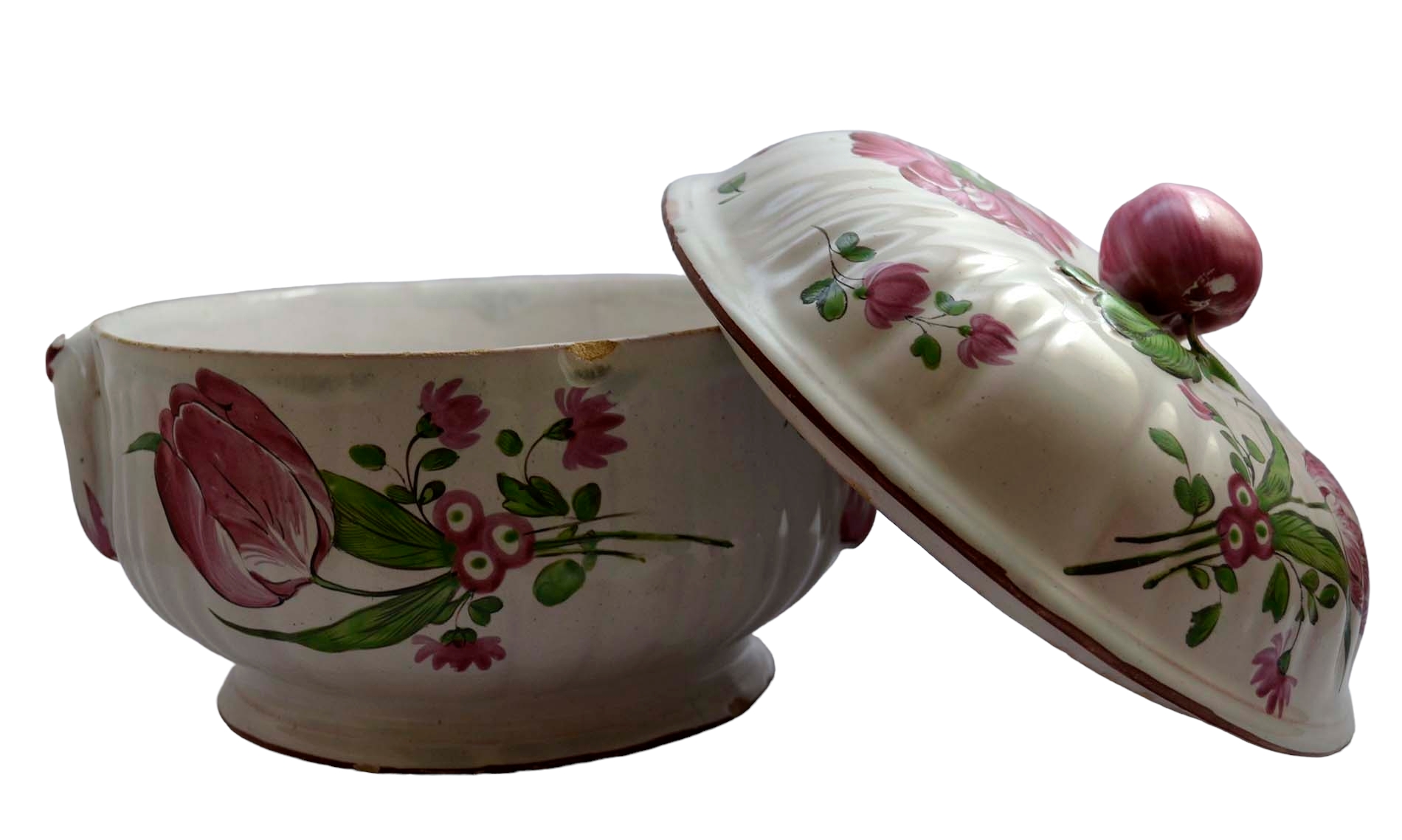 ZUPPIERA in maiolica, decorata da mazzi fioriti, ai lati anse ad anello, coperchio con presa a mela Francia XVIII secolo h cm 22 x 22