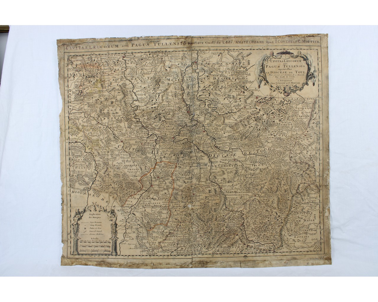 CARTINA GEOGRAFICA DE LISLE Guillaume(Francia) Civitas Leucorumsive Pagus Tullensis ajourdui le Diocese de Toul. Titolo in alto lungo la platina ed altro titolo entro cartiglio in alto a destra. Carta geografica stampata ad Amsterdam sec.XVIII. Incisione rame h cm 52 x 61,5