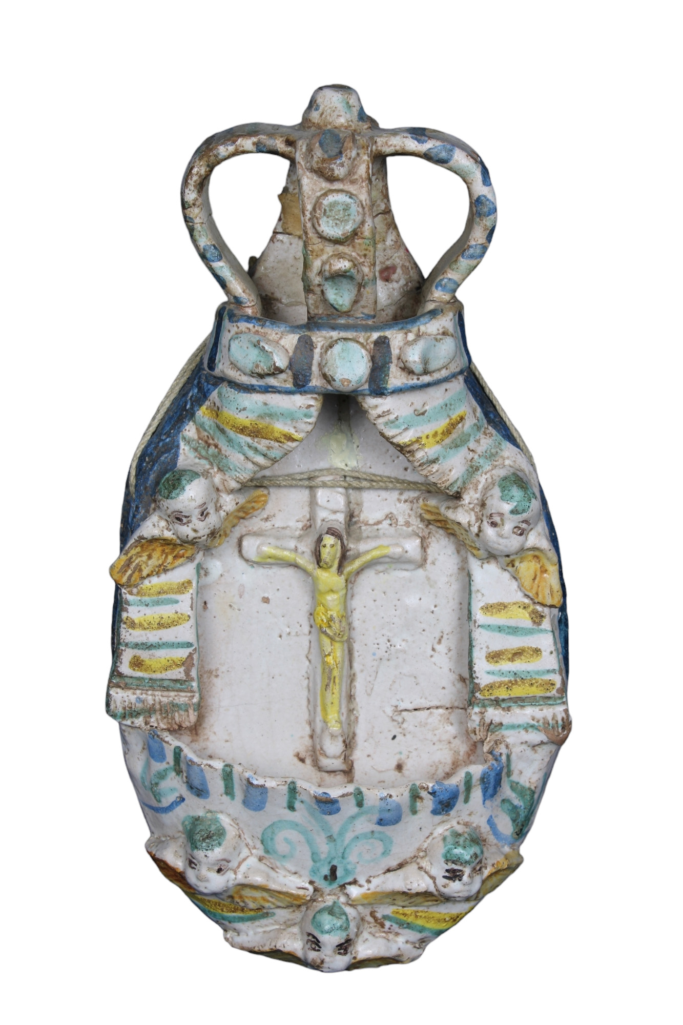 ACQUASANTIERA in maiolica policroma raffigurante Crocifisso e angeli, vecchi incollaggio alla corona manifattura popolare sud Italia XIX secolo h cm 33 x 17 x 6