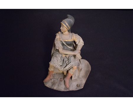 SCULTURA DA PRESEPE in cartapesta policroma raffigurante soldato con base in legno Sicilia XVIII secolo h cm 20 x 13 x 14