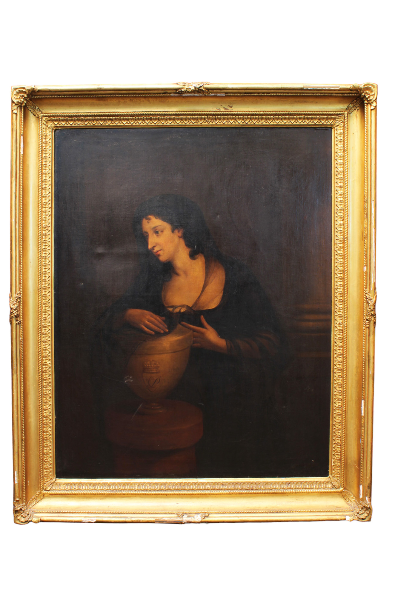 OLIO SU TELA raffigurante figura femminile dentro cornice in legno dorato scuola italiana 1810 circa h cm 129 x 103 / cornice h cm 151 x 125,5