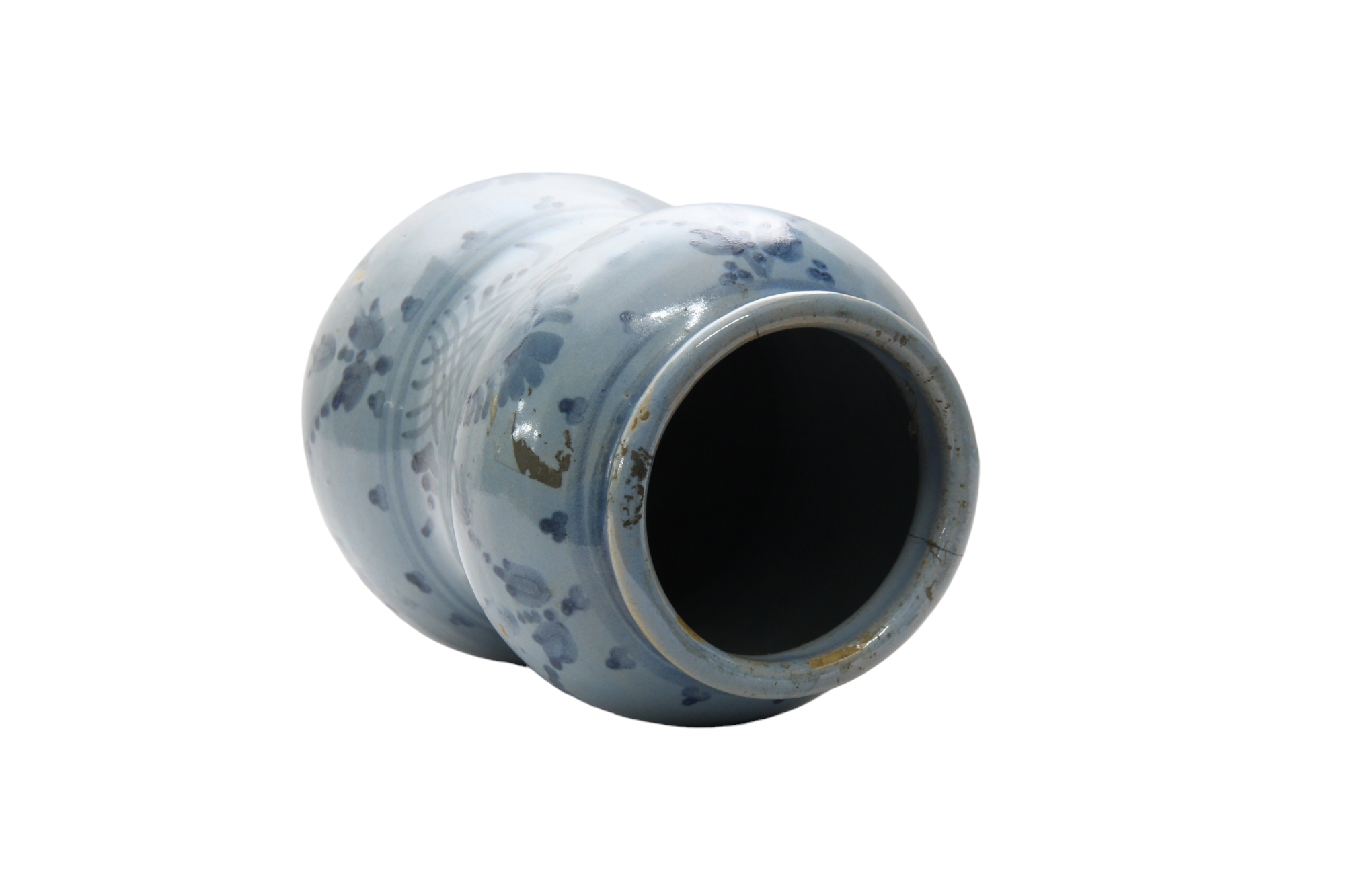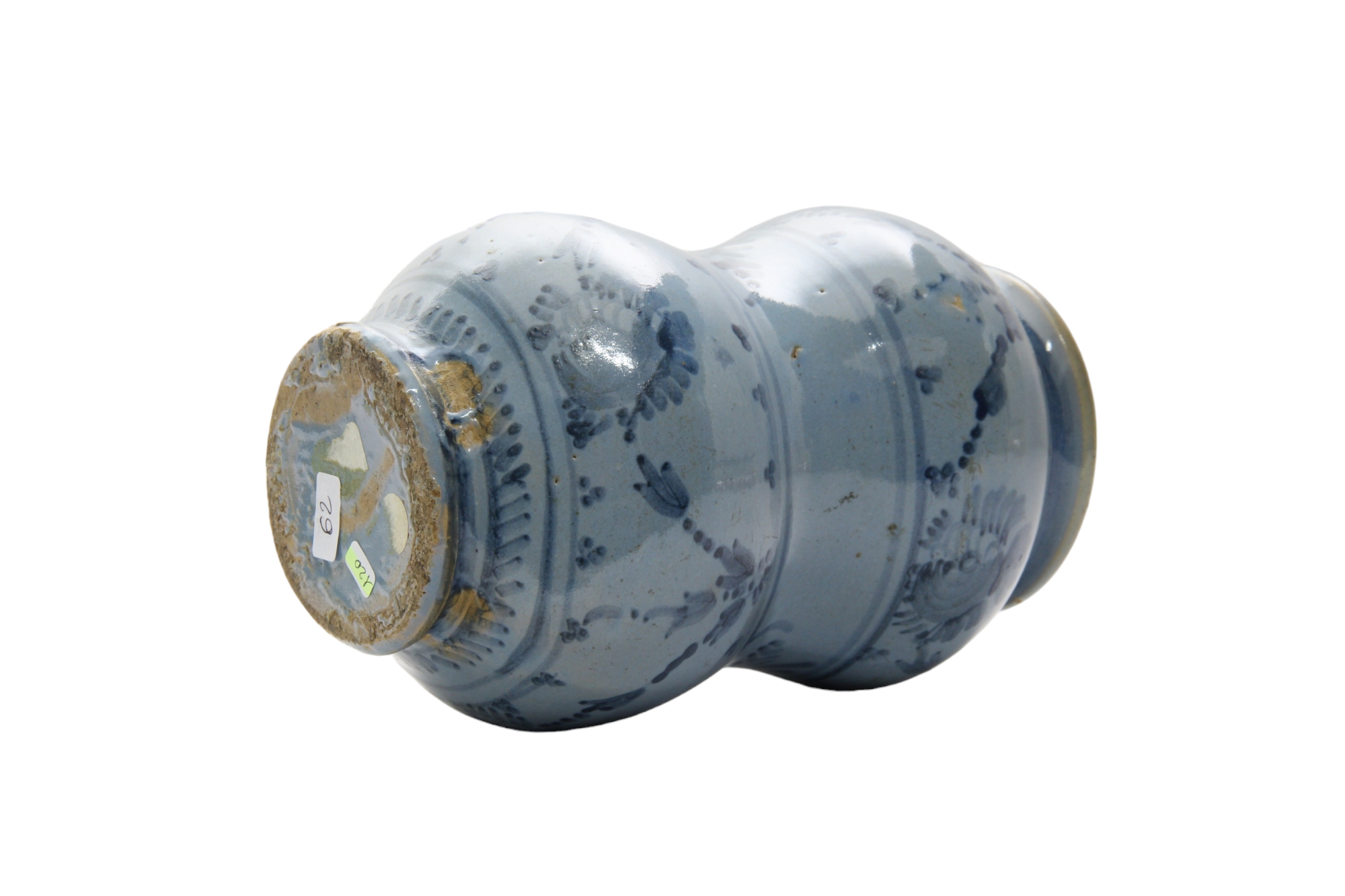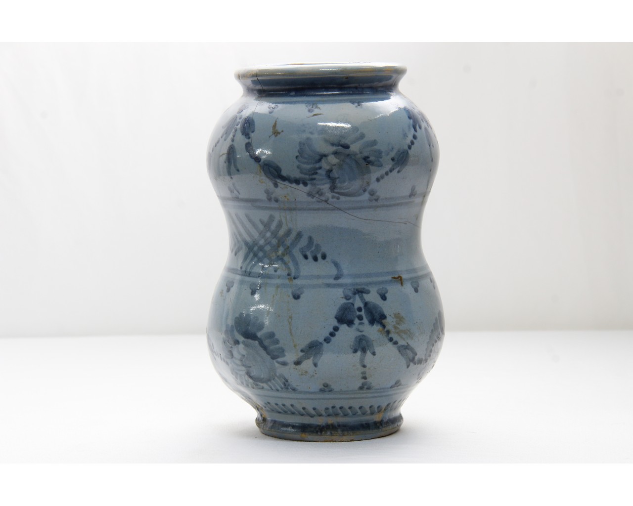 ALBARELLO DA FARMACIA in maiolica a fondo blu decori fogliacei Liguria 1710 circa h cm 21,5 x 13