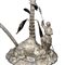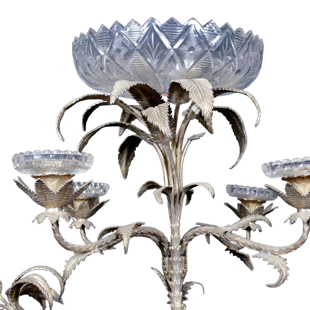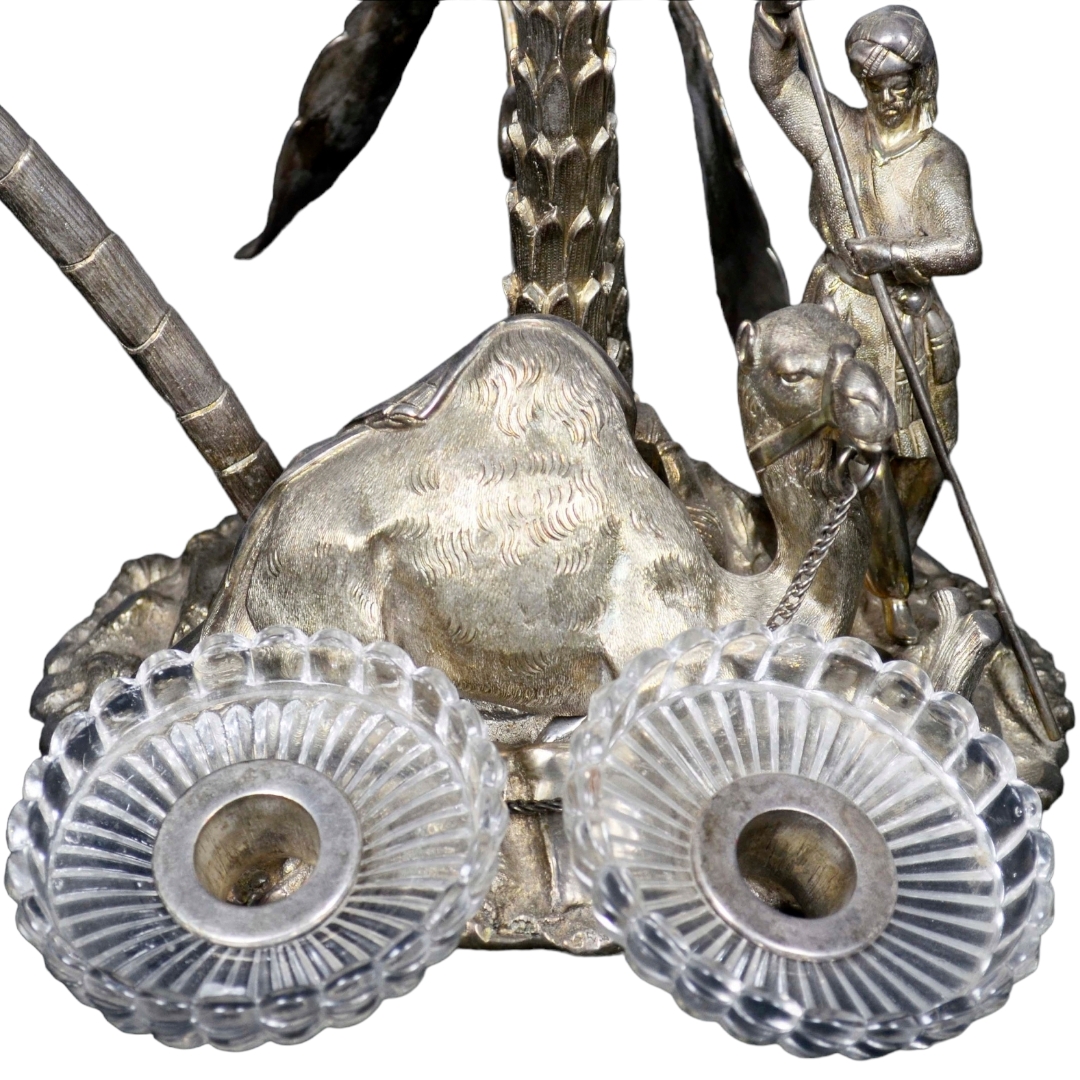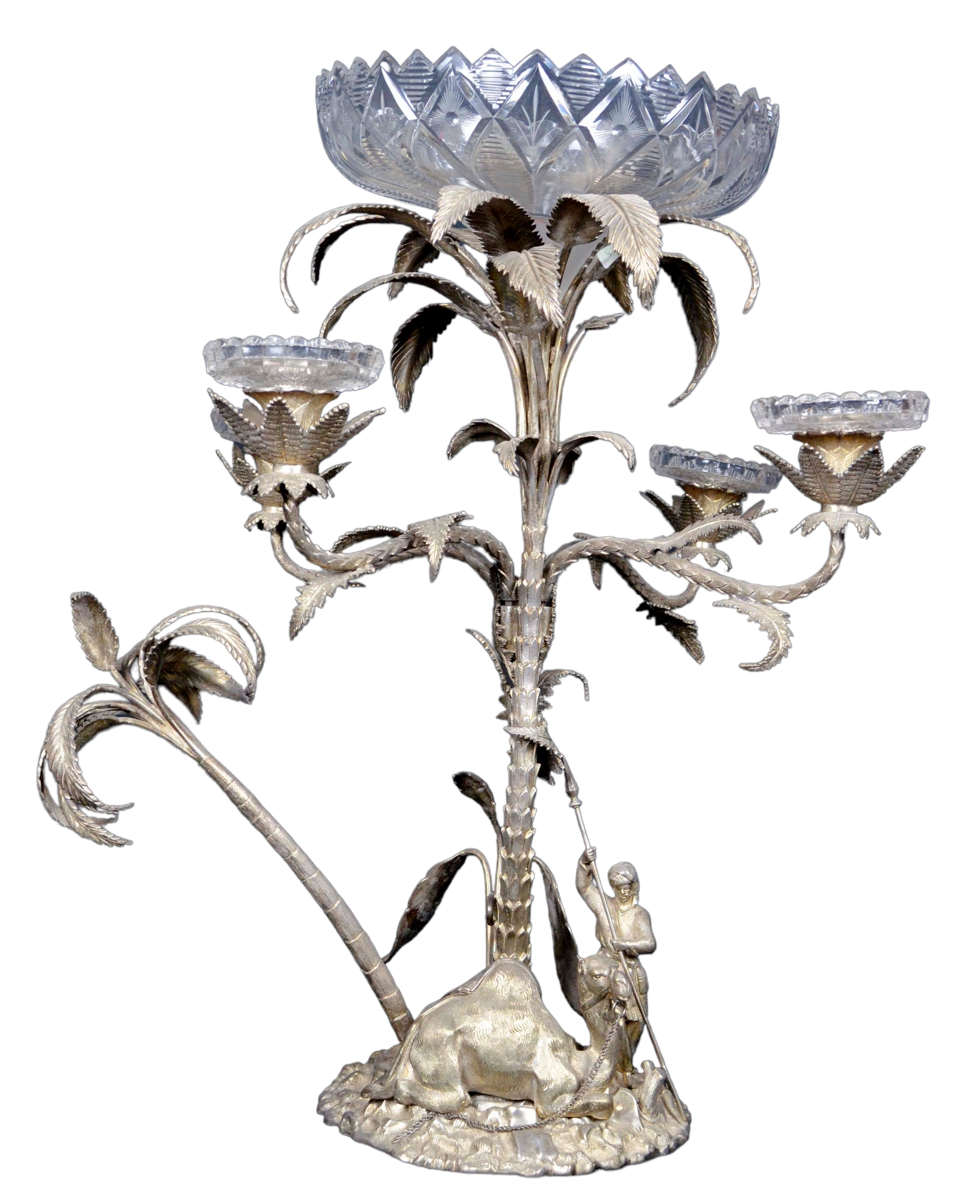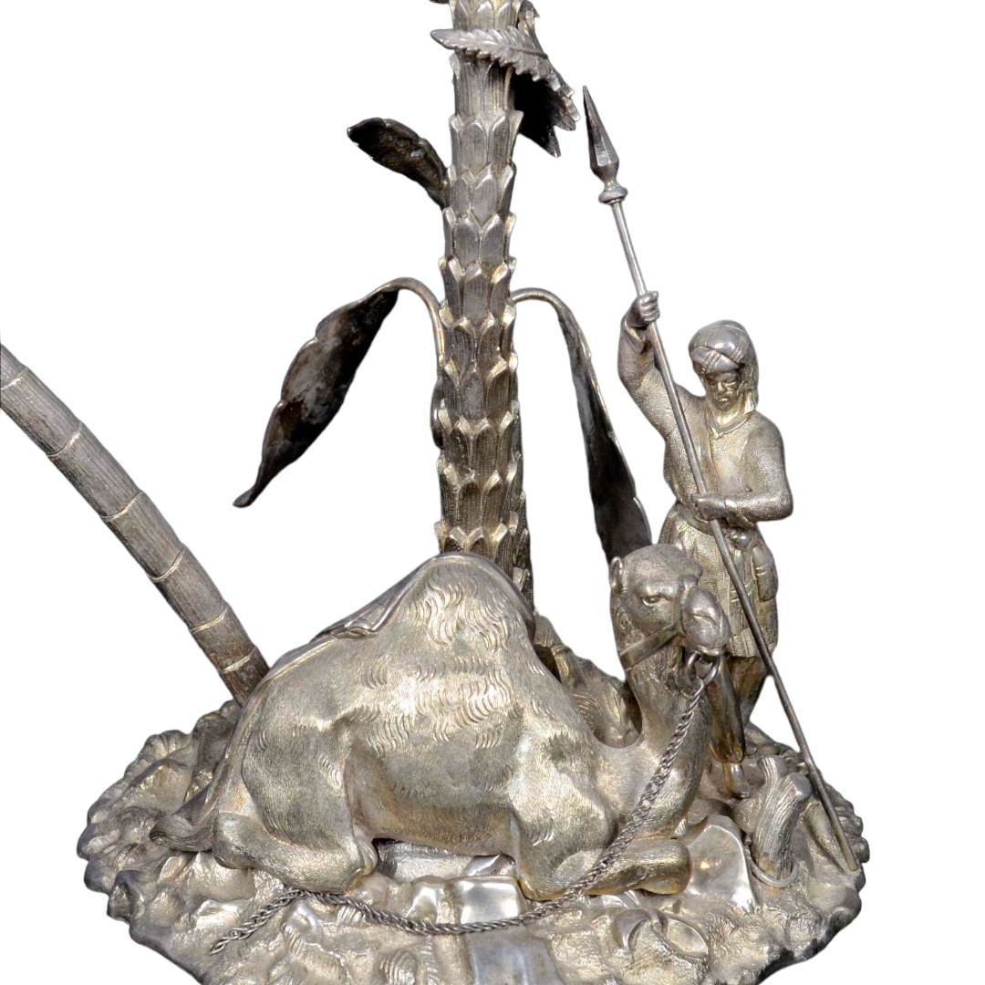 CENTROTAVOLA in metallo argentato finemente cesellato, Raff Personaggio Orientale con dromedario, porta candele supportato da palme con vasca centrale in cristallo probabilmente Francia XIX h cm 57 x 45 x 39