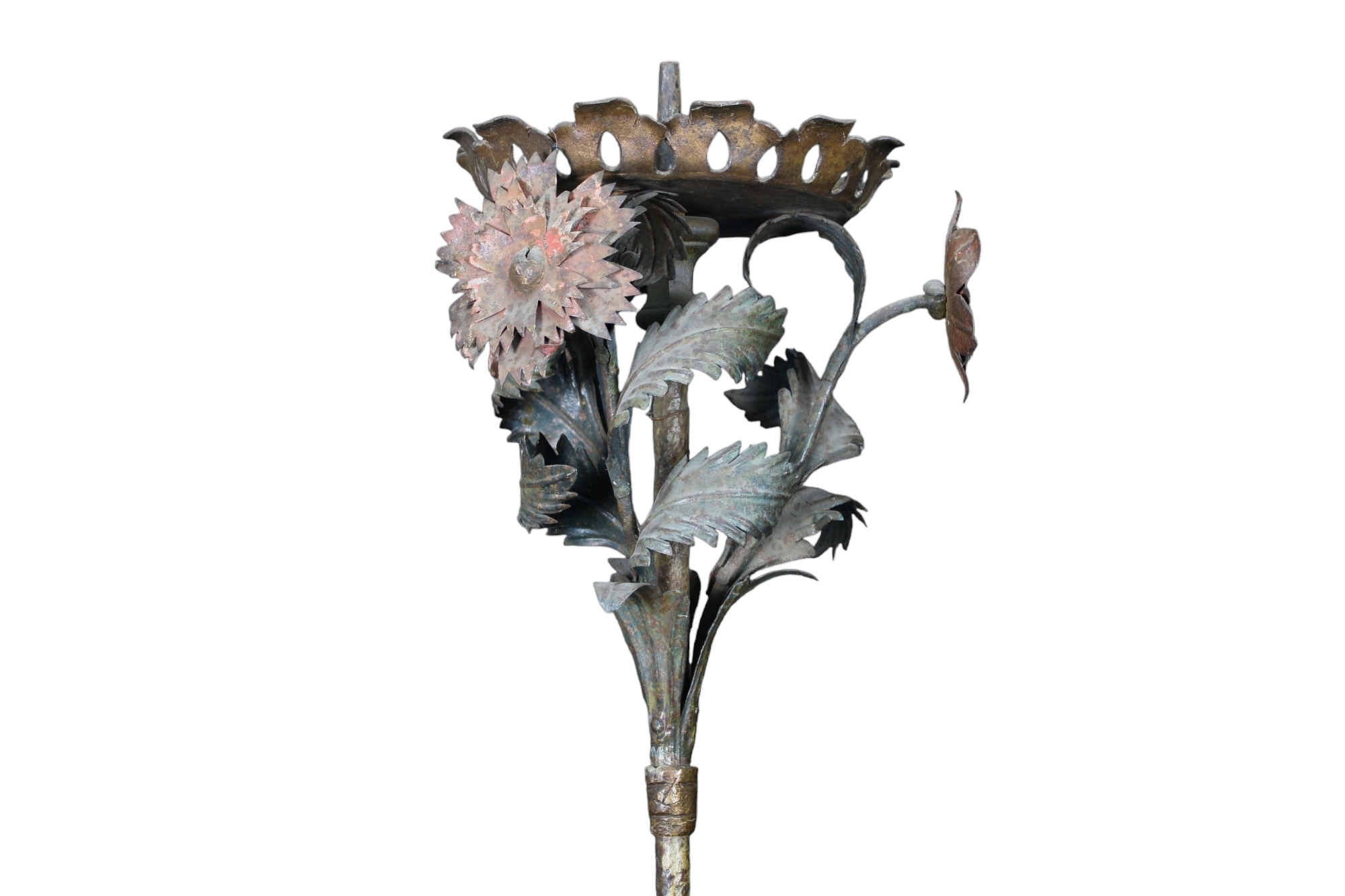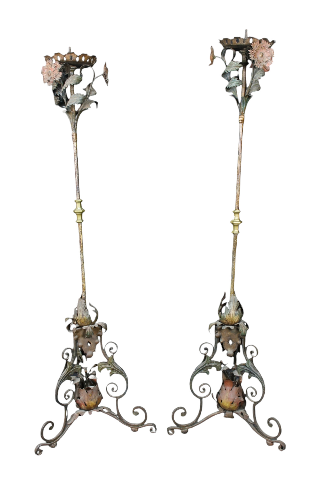COPPIA DI IMPORTANTI TORCERI in ferro dipinto, arricchito da foglie e fiori in ferro policromo maestranze veneziane XVII / XVIII secolo h cm 190 x 58