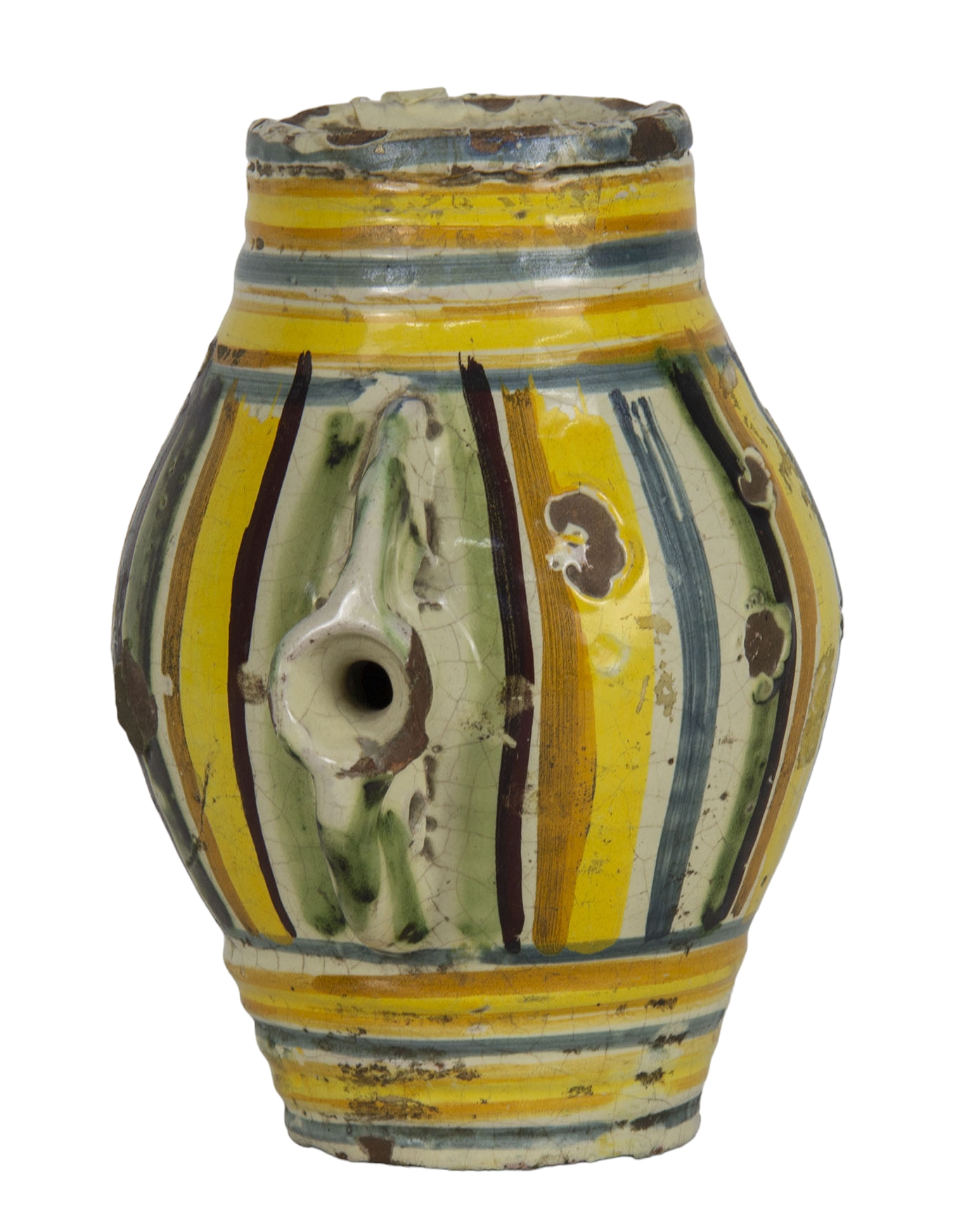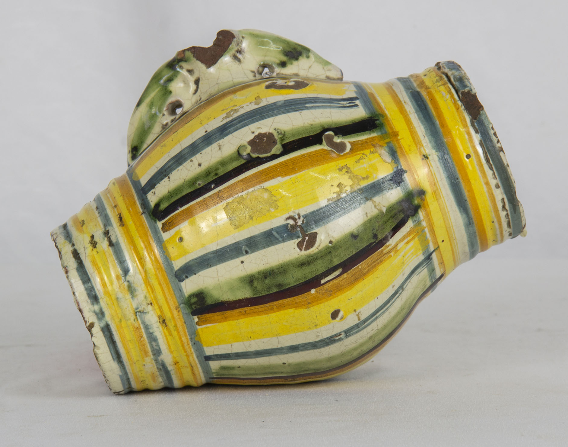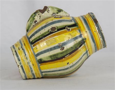 SCALDAMANI in maiolica a forma di botte, usure del tempo Ariano Irpino XVIII secolo h cm 18 x Ø 14