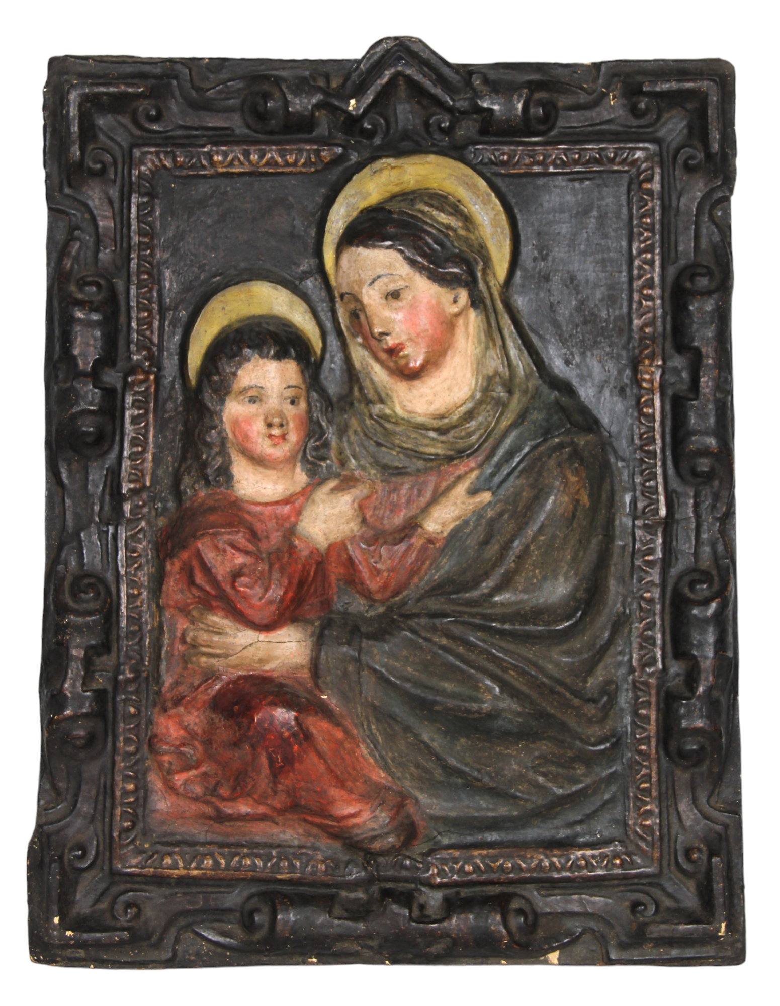 ALTORILIEVO in cartapesta policroma raffigurante Sant'Anna con Maria bambina manifattura centro Italia 1580-1620 h cm 82 x 61