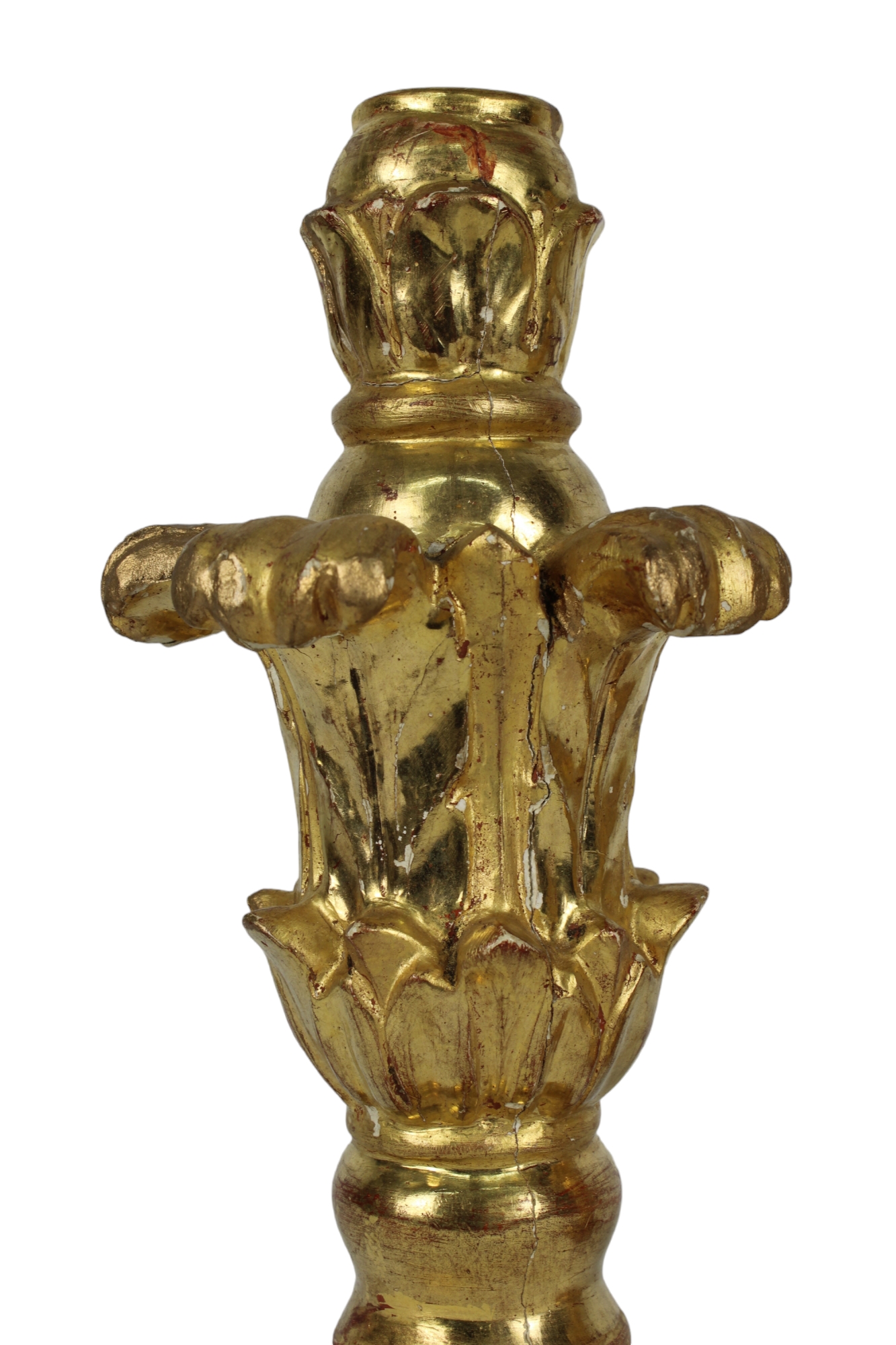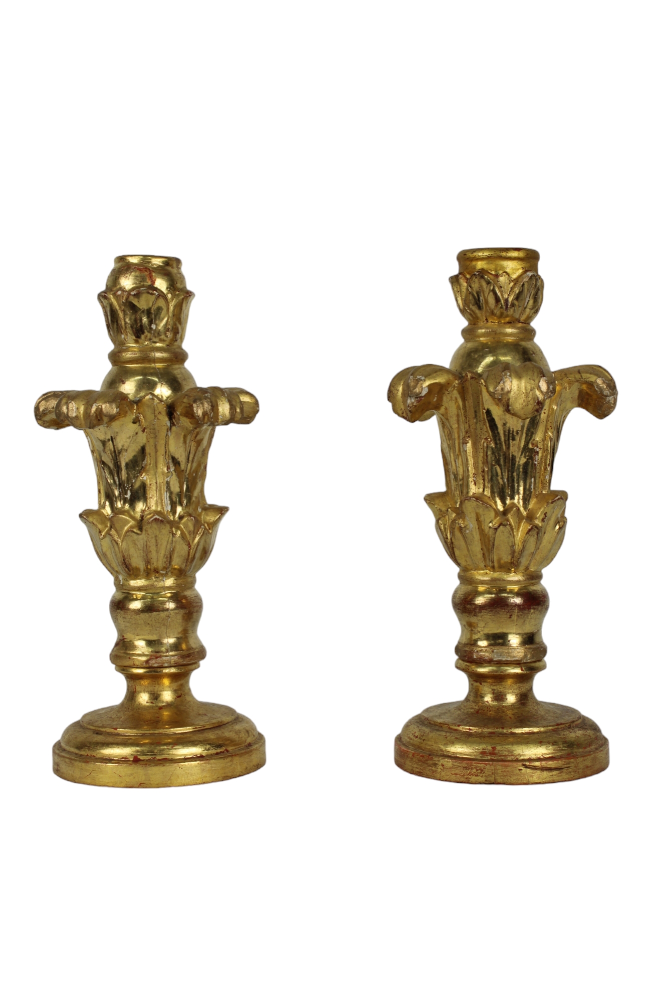 COPPIA DI ELEGANTI PORTA CANDELA MONOCERA in legno finemente scolpiti e dorati ad oro zecchino Roma XIX secolo h cm 27 x 11