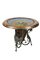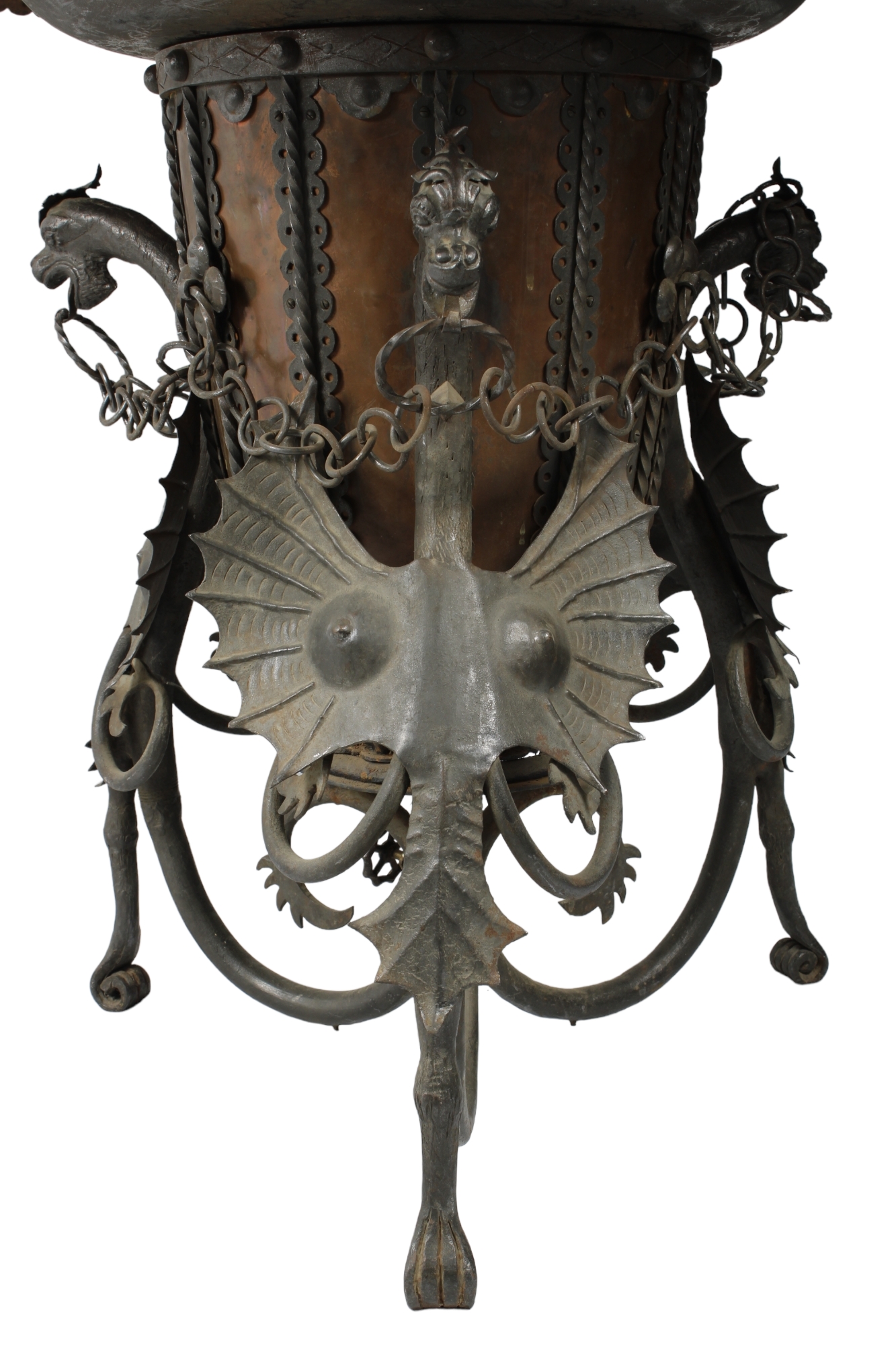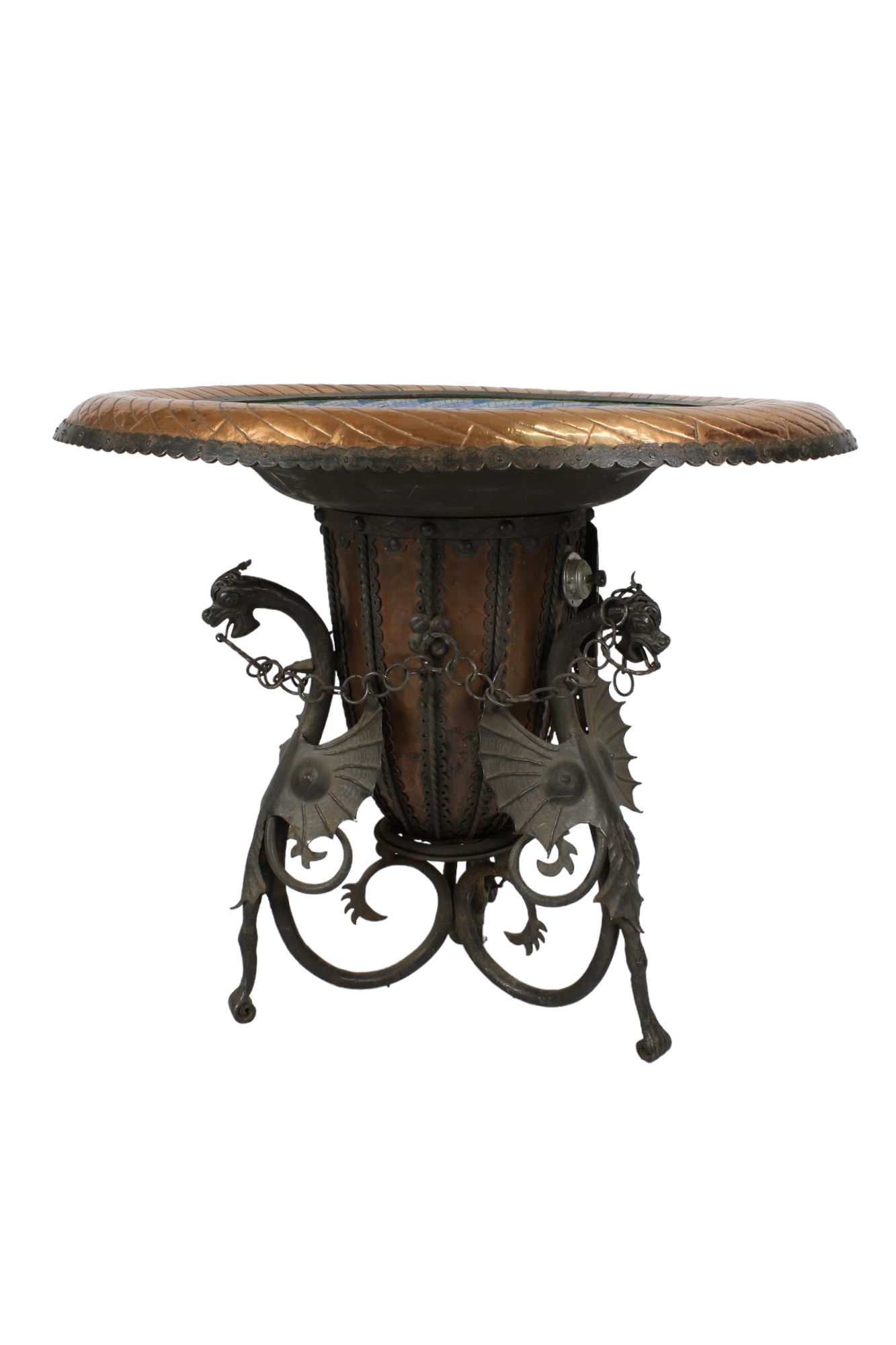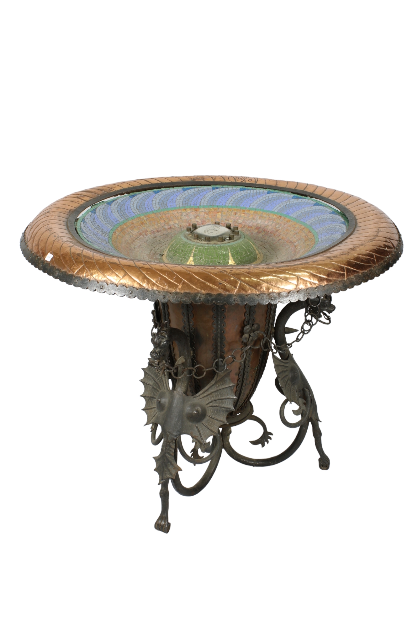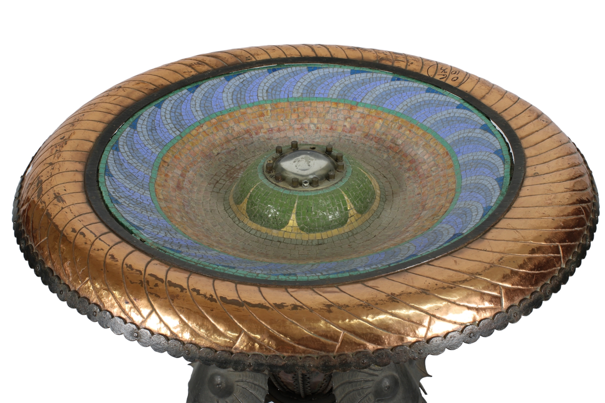 CURIOSA FONTANA ART NOUVEAU con vasca in mosaico di marmo e vetro colorato, guarnita da profilo in ferro battuto e rame sbalzato sorretta da base raffigurante animali fantastici in ferro battuto e rame Francia fine XIX h cm 85 x 100