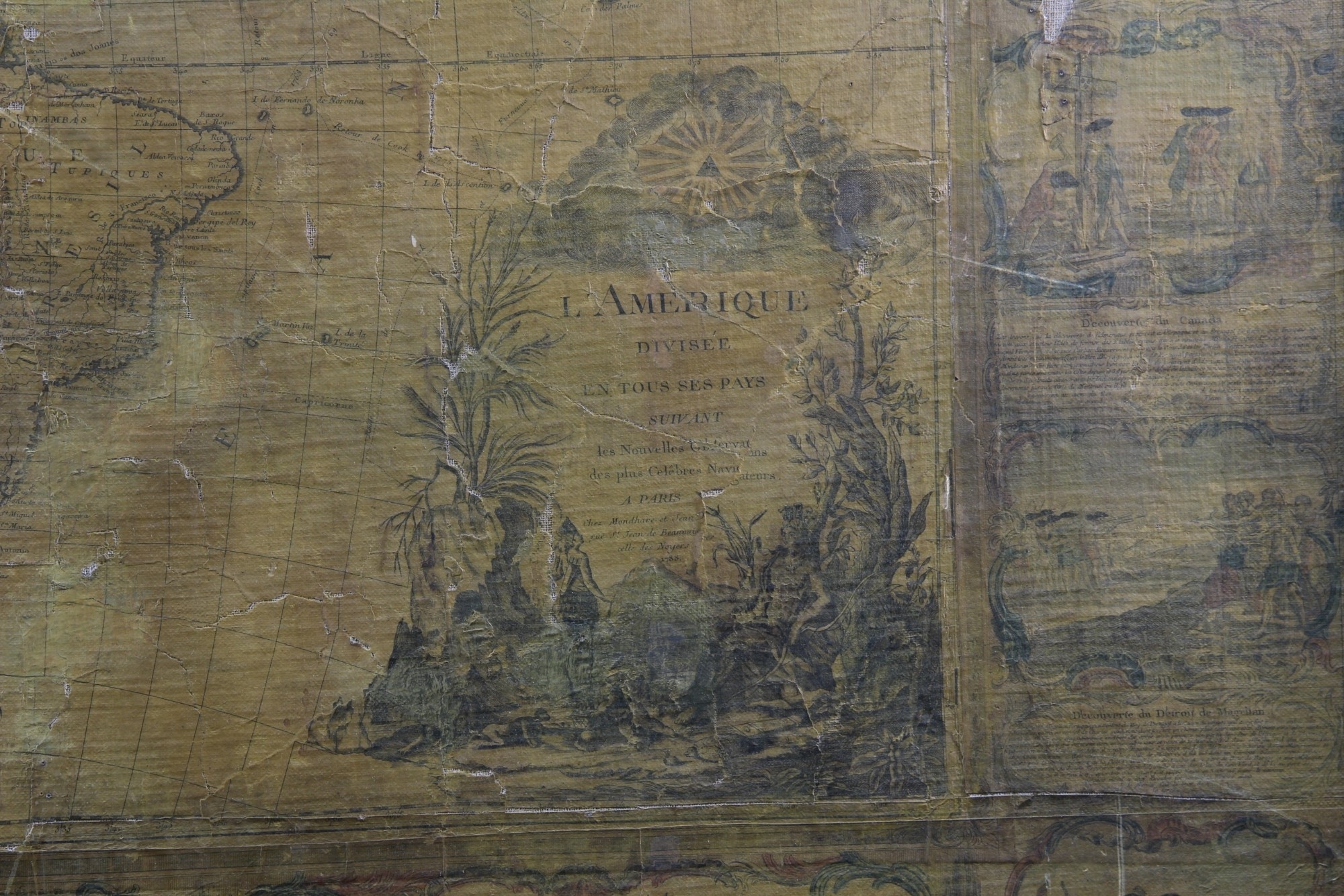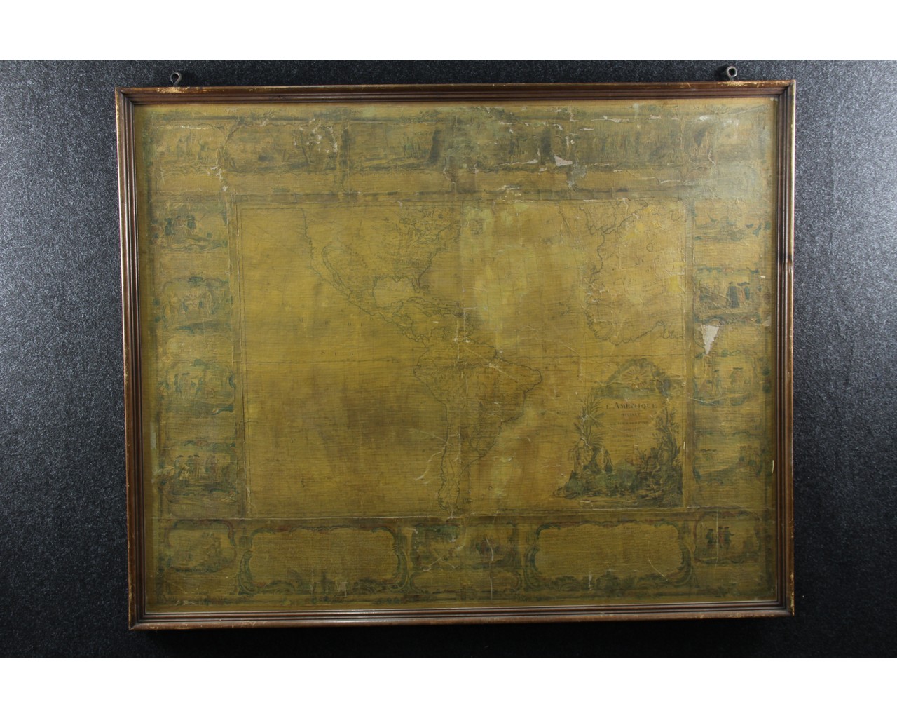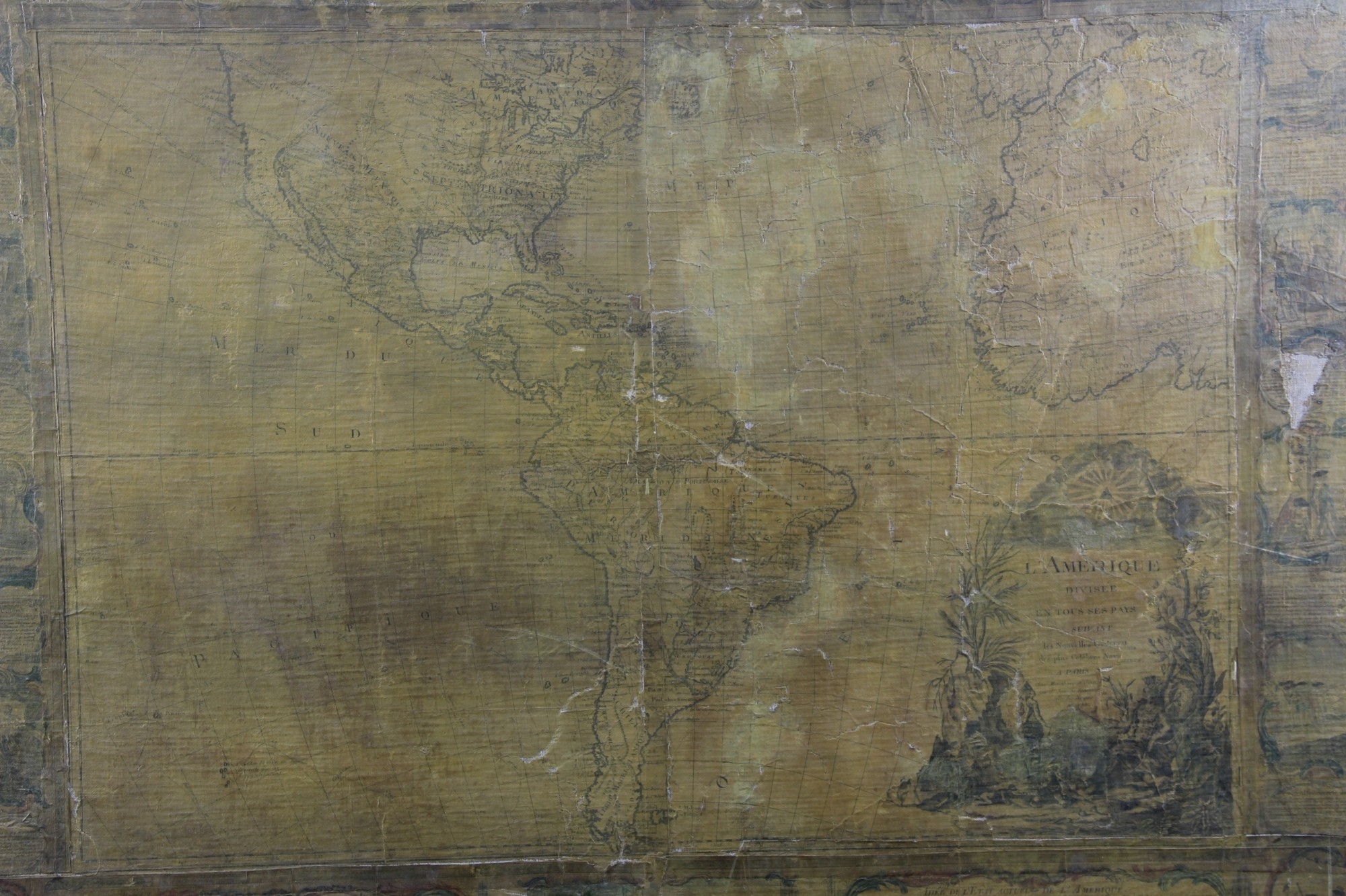 IMPORTANTE CARTINA GEOGRAFICA SU CARTA APPLICATA SU TELA Raffigurante L'America e scene di vita, reca scritta Parigi 1788 già collezione Pietro Accorsi, mancanze e usure del tempo h cm 120 x 150