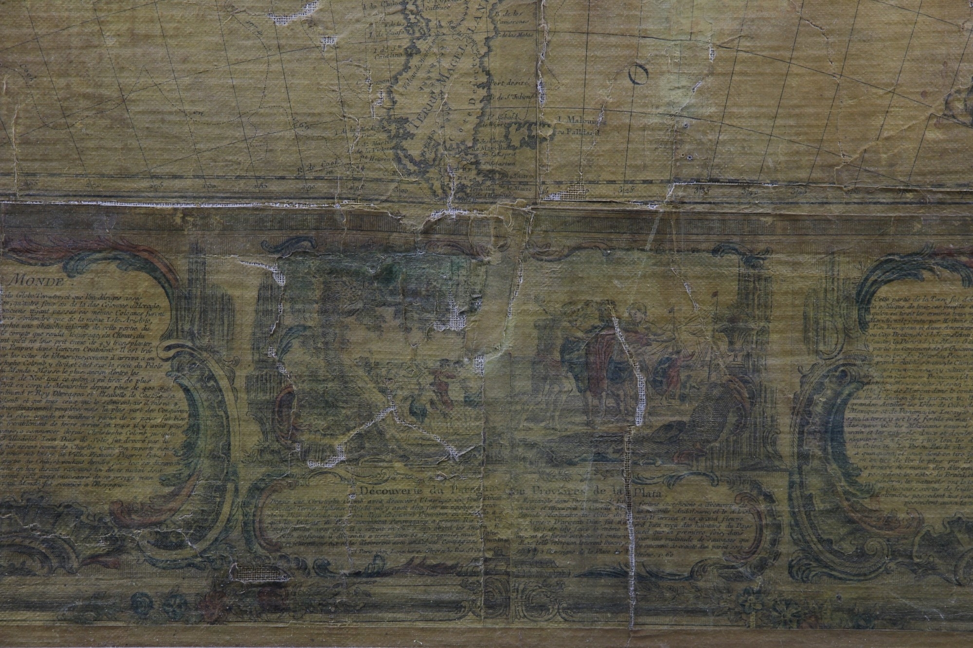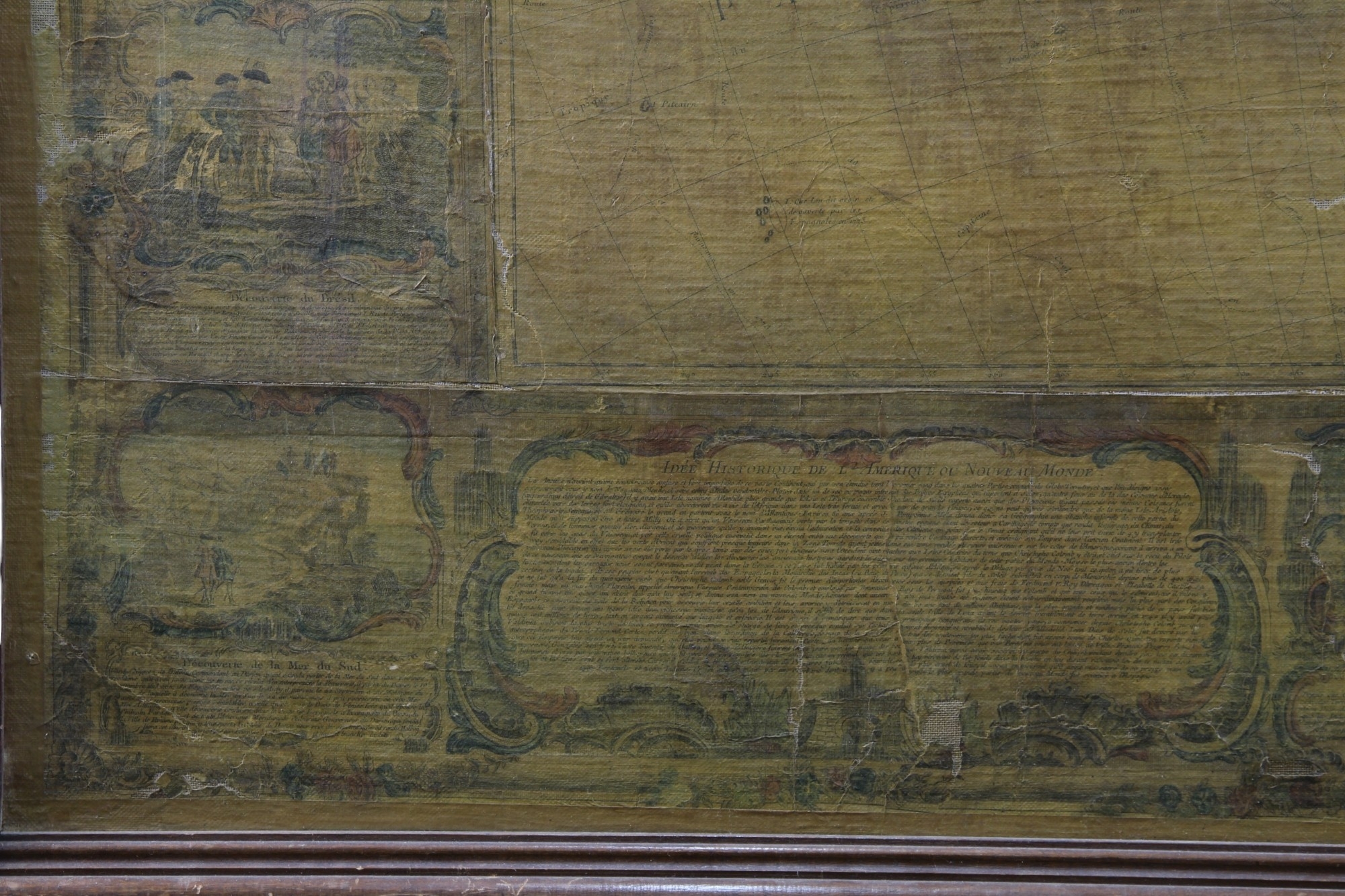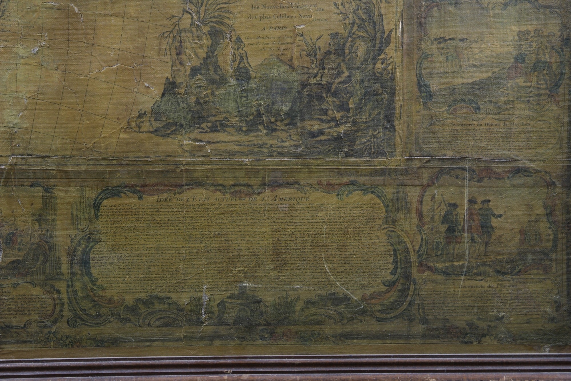 IMPORTANTE CARTINA GEOGRAFICA SU CARTA APPLICATA SU TELA Raffigurante L'America e scene di vita, reca scritta Parigi 1788 già collezione Pietro Accorsi, mancanze e usure del tempo h cm 120 x 150
