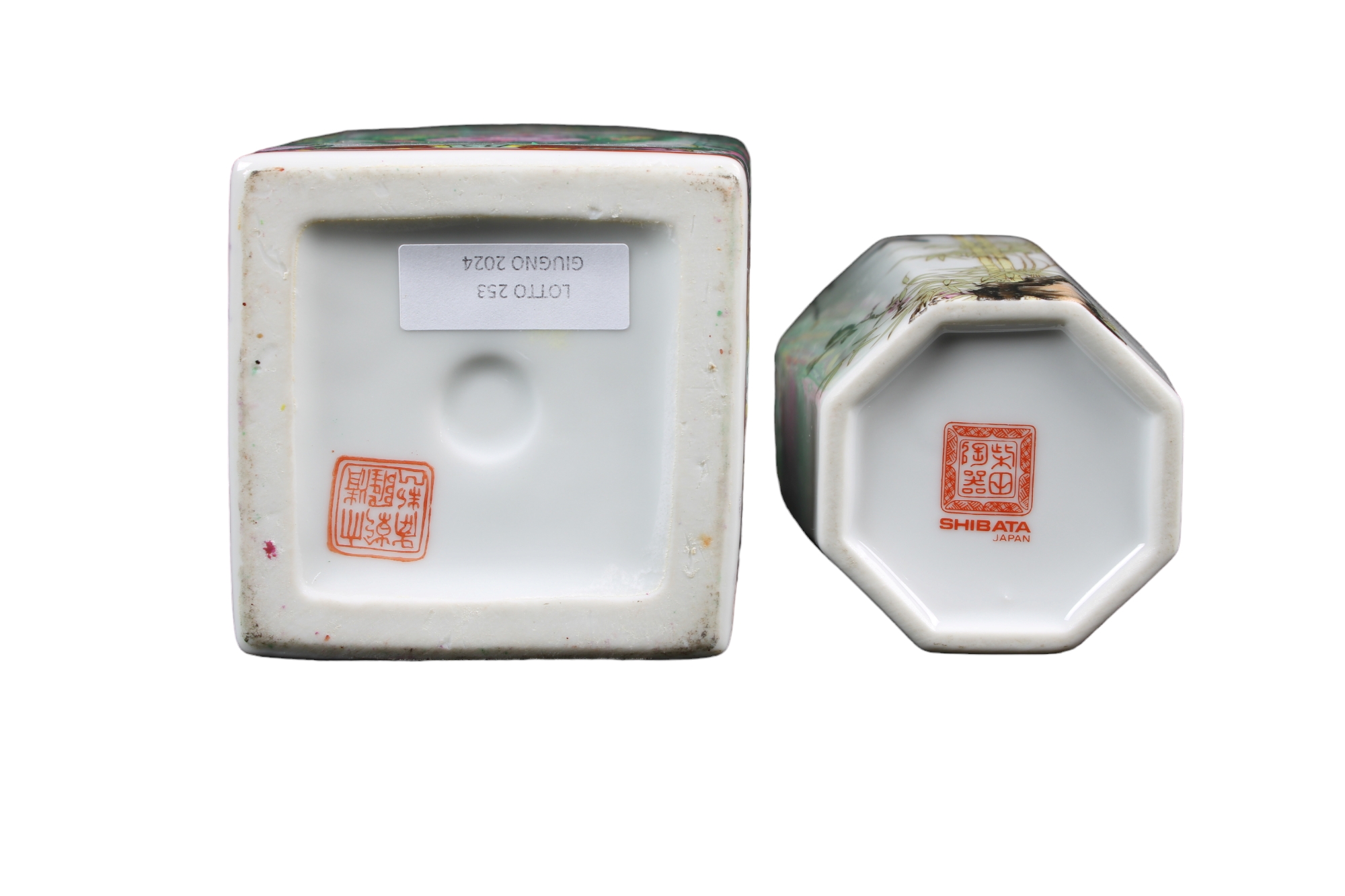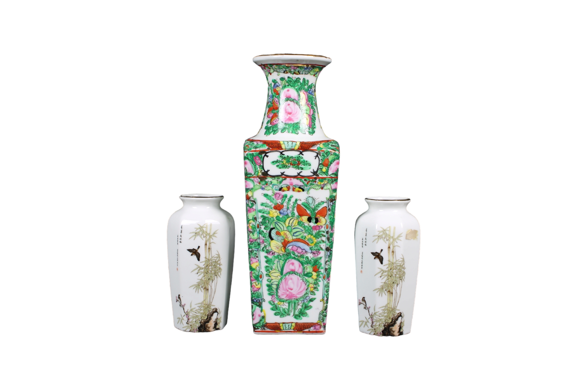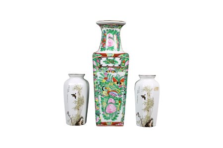 LOTTO COMPOSTO DA un vaso e una coppia di vasi in porcellana dipinta a motivi di flora e fauna con lumeggiature in oro manifattura Cina XX secolo h cm 31 x 10 / h cm 15,5 x 8