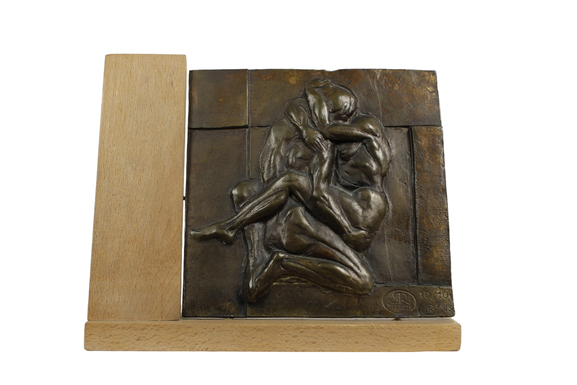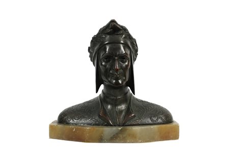 LOTTO COMPOSTO DA una scultura in bronzo raffigurante mezzo busto di dante con base in onice e una placca a bassorilievo firmata Rizzuti multiplo 10 di 10 montata su supporto in legno h cm 15 x 19 x 9 / h cm 16 x 20