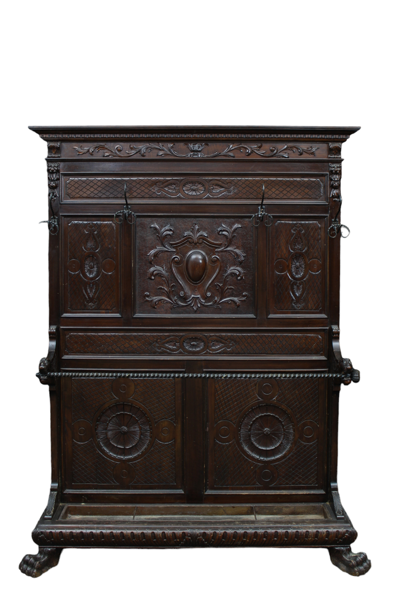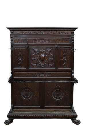ATTACCAPANNI CON BASTONIERA in legno di noce riccamente scolpito di gusto rinascimentale Sicilia fine 800 h cm 202 x 155 x 35