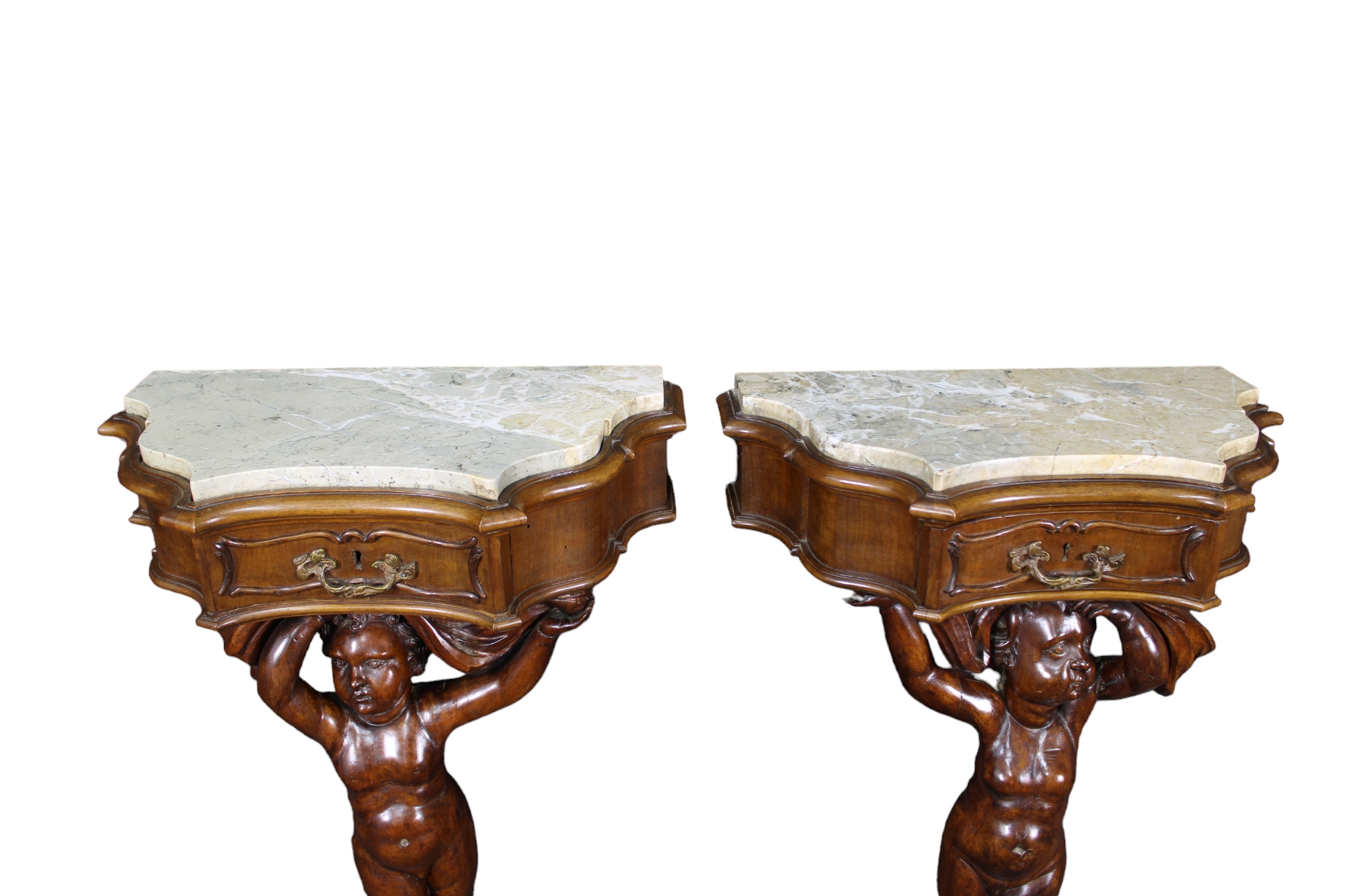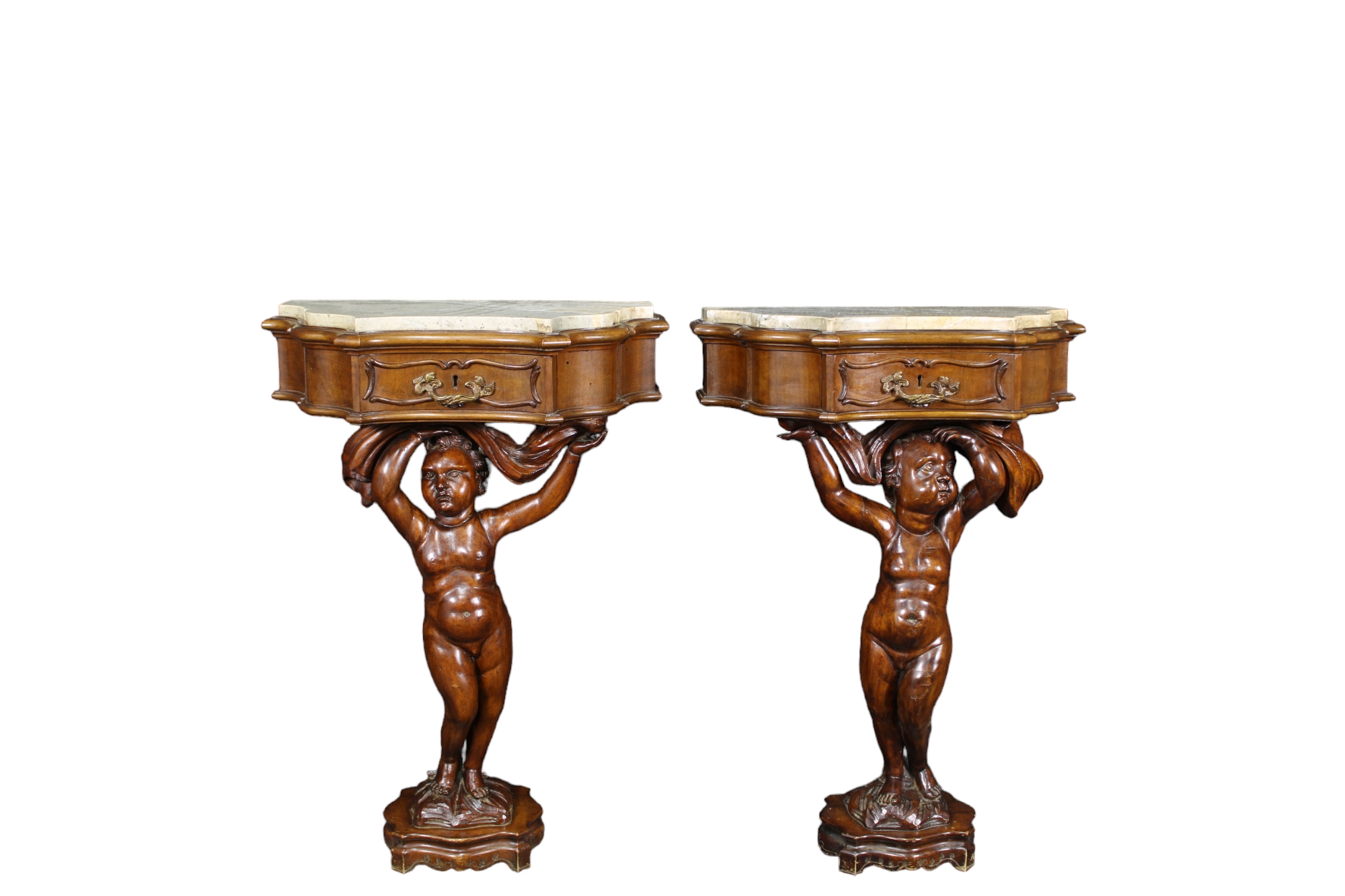 COPPIA DI COMODINI in legno di noce scolpito raffigurante putti Sicilia primi 900' con piano in marmo breccia siciliana XIX/XX secolo h cm 74 x 53 x 28