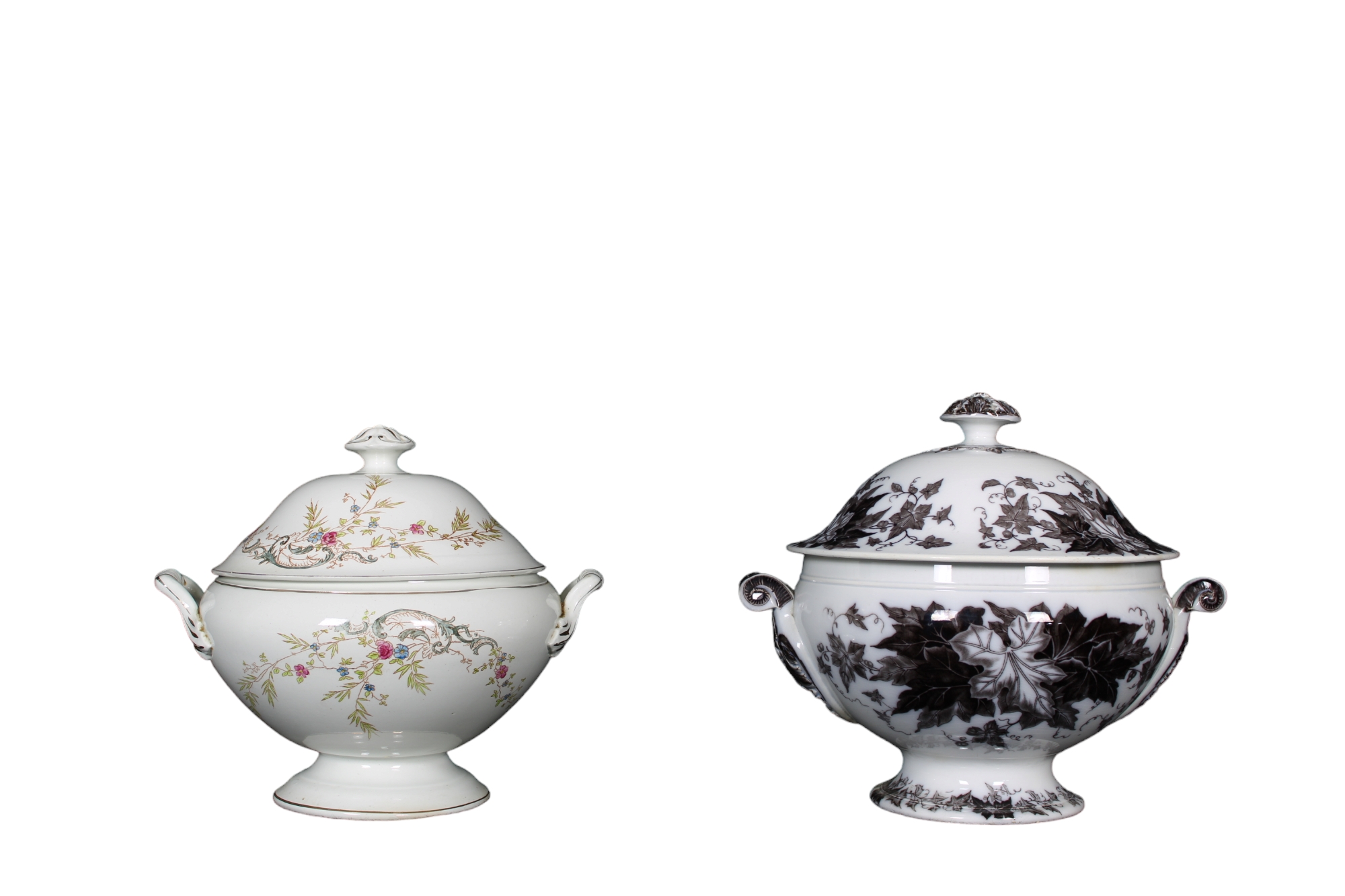 LOTTO COMPOSTO DA 2 zuppiere in porcellana dipinta di cui 1 manifattura Florio Palermo e 1 manifattura inglese Bryonia fine 800 h cm 30 x 34 / h cm 27 x 30