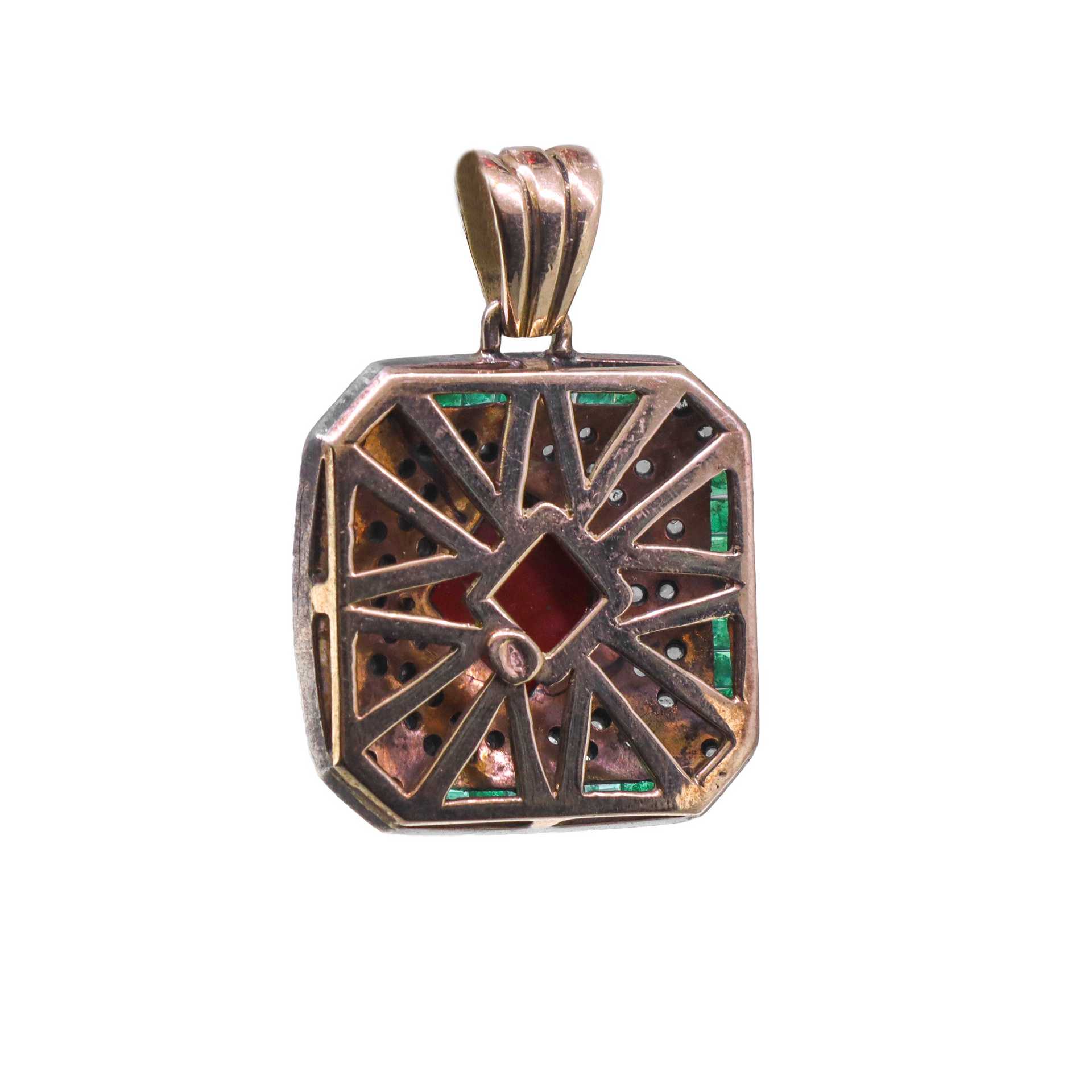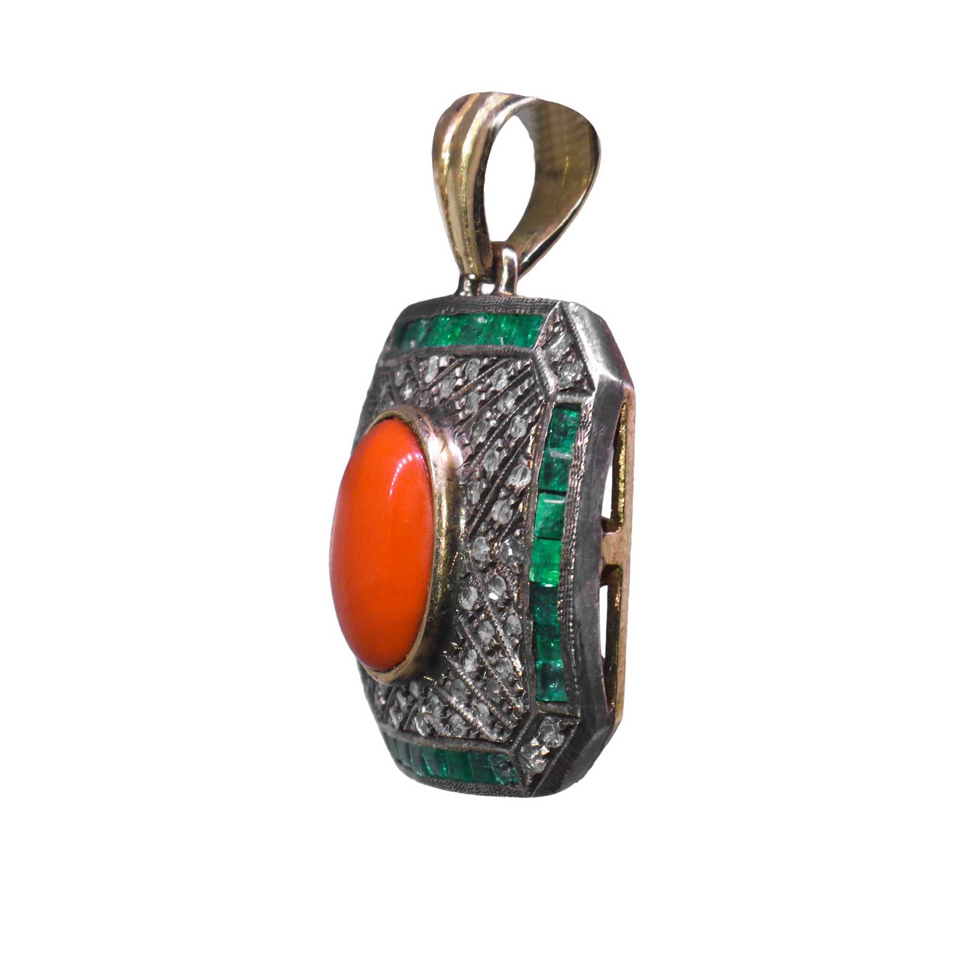 Ciondolo in oro bianco a basso titolo e argento con diamanti taglio antico, corallo giapponese e smeraldi